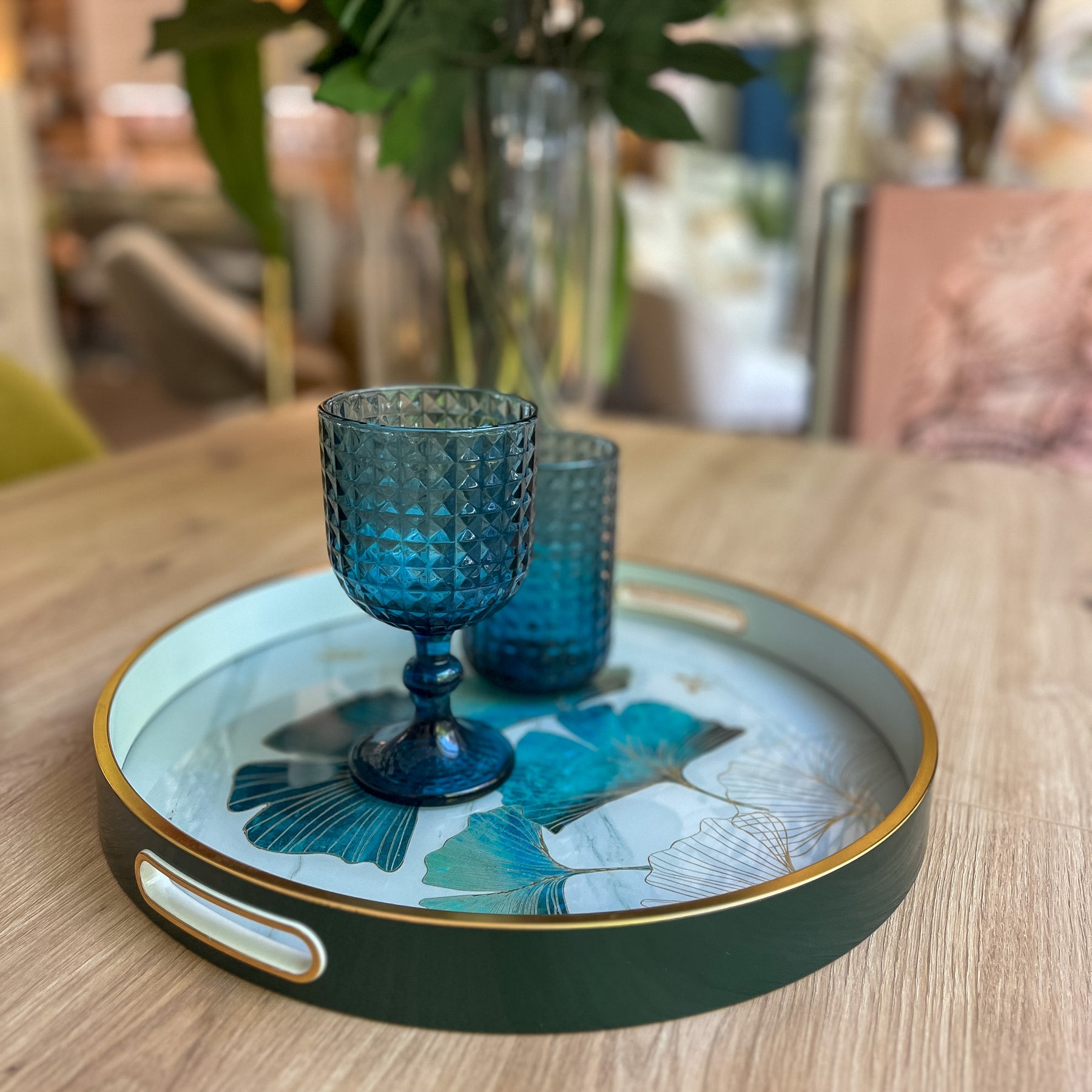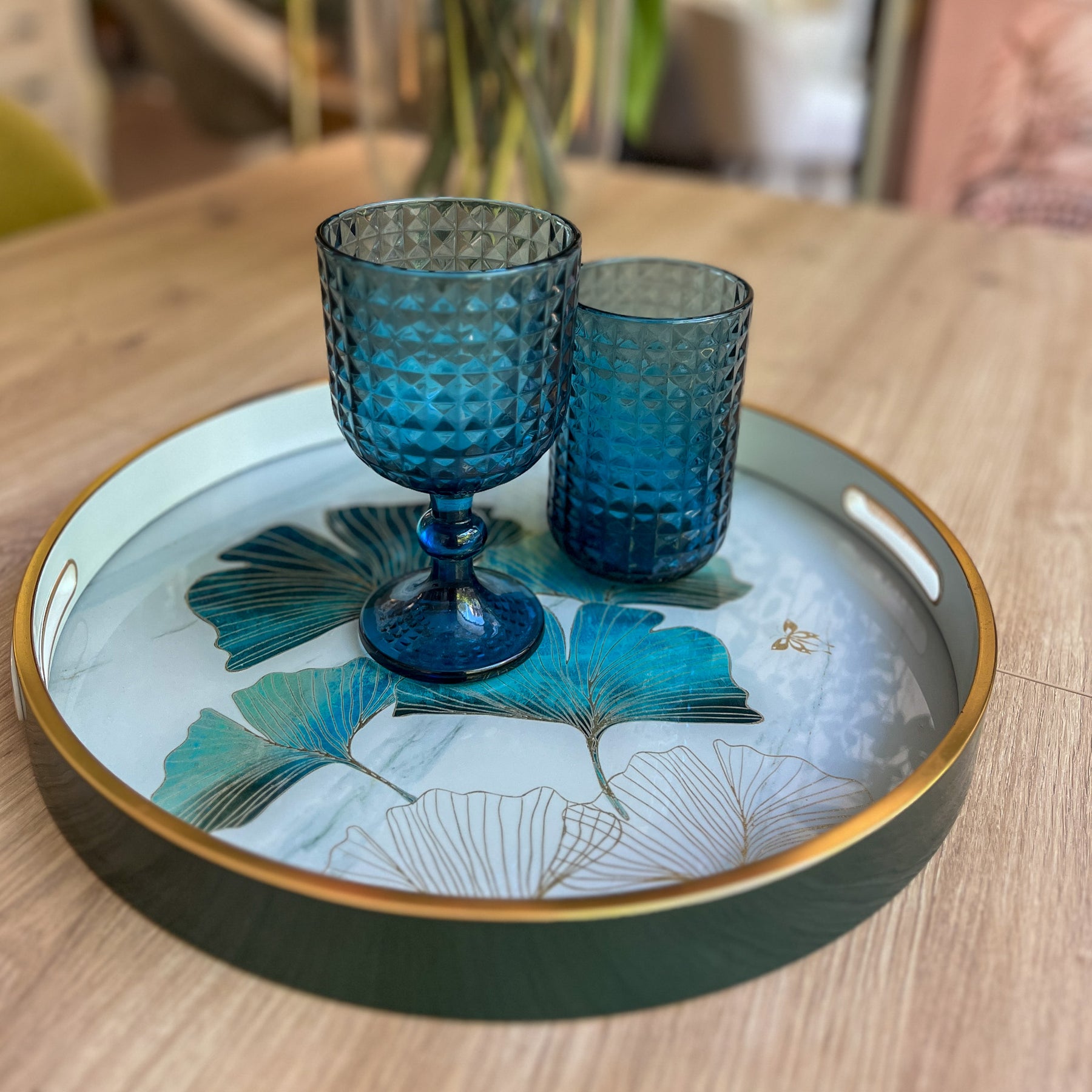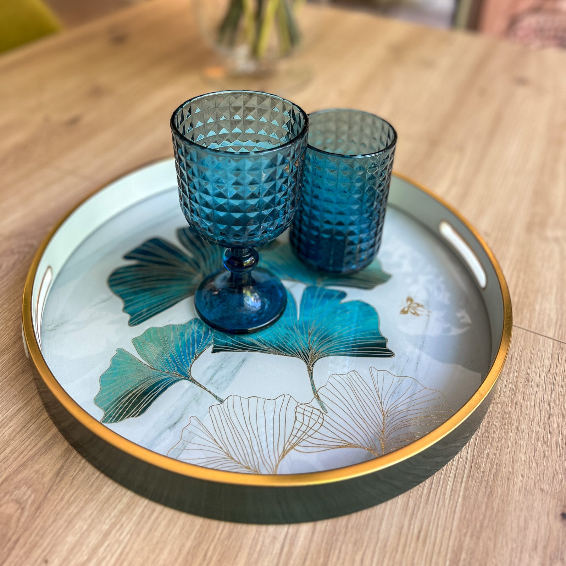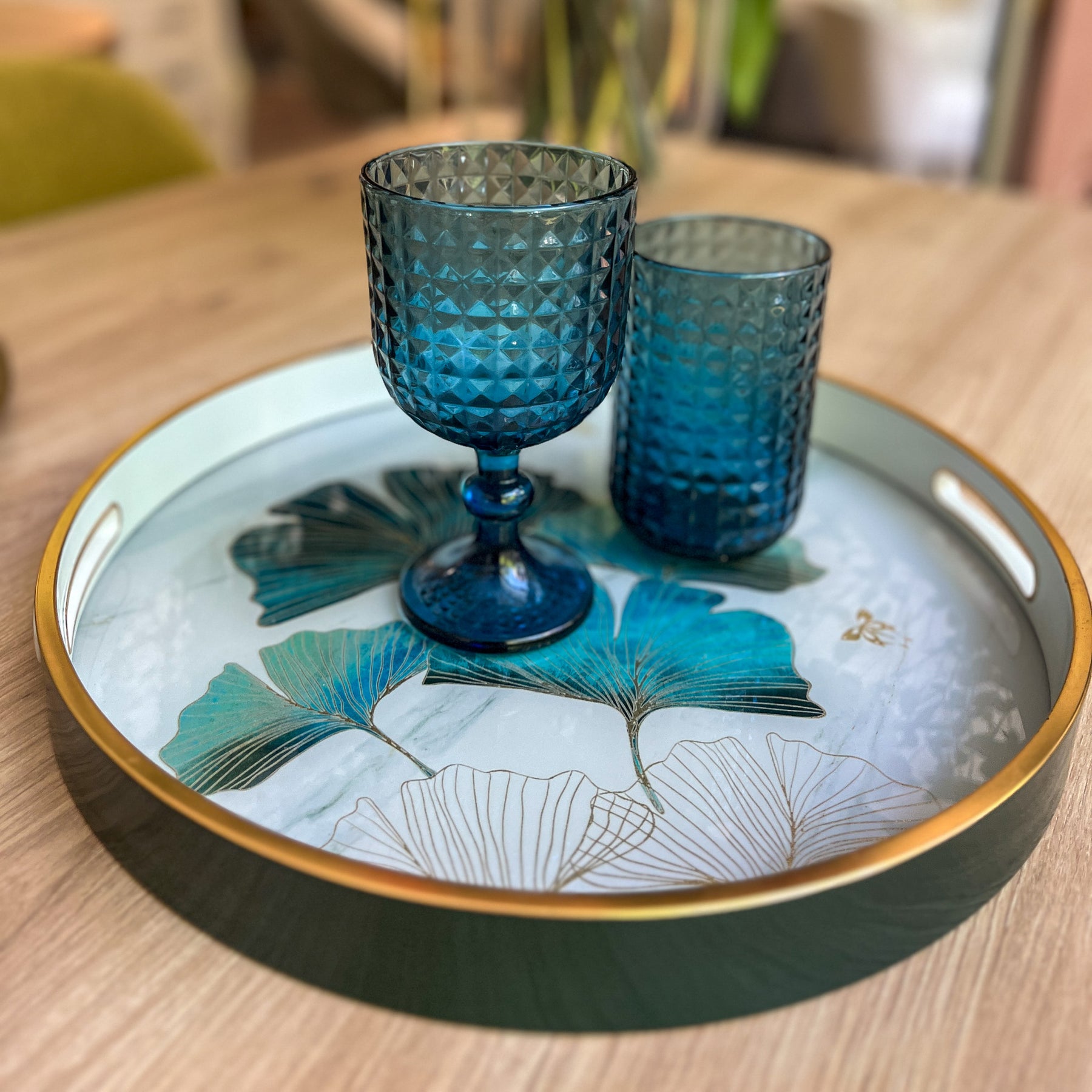 Con un diseño elegante y lleno de frescura, esta bandeja redonda de resina destaca por su delicado estampado de hojas de ginkgo en tonos verdes y dorados, un motivo natural que aporta serenidad y un aire sofisticado. El borde metálico en acabado dorado enmarca la pieza con un toque refinado, convirtiéndola en un accesorio decorativo único.