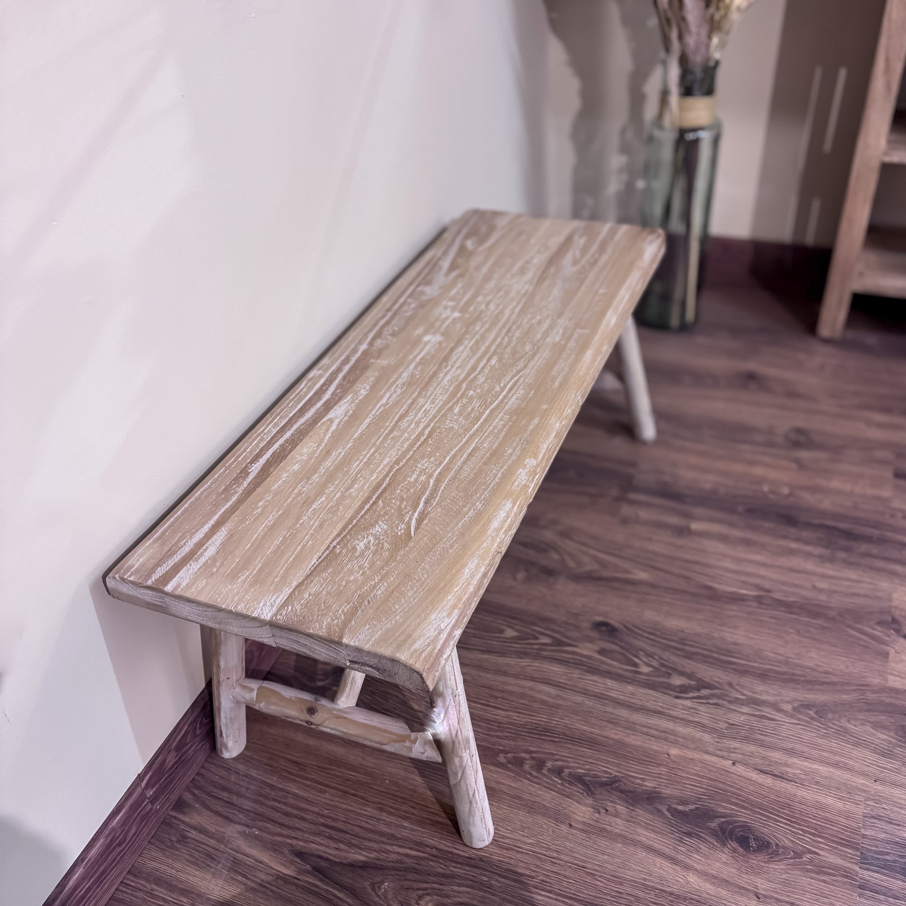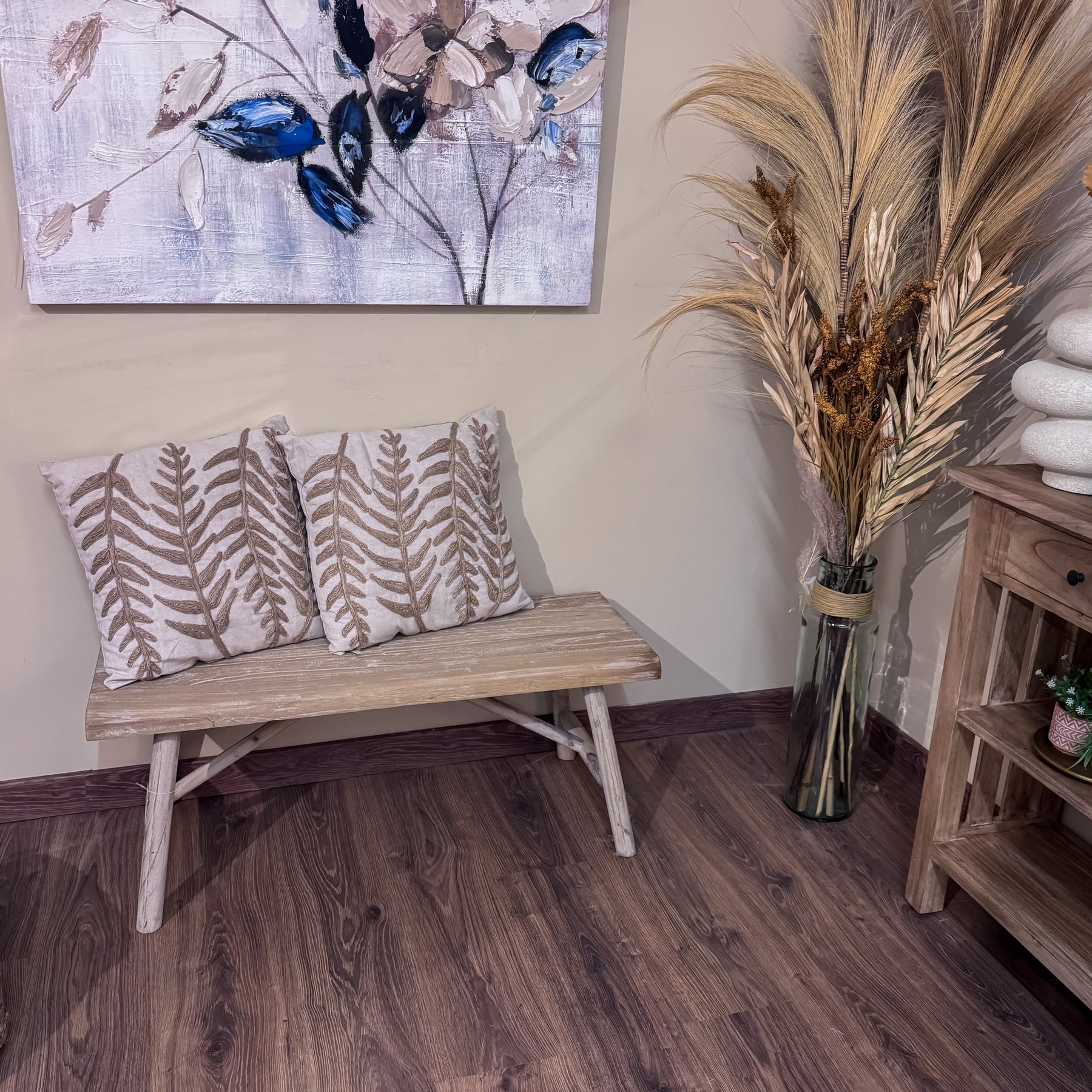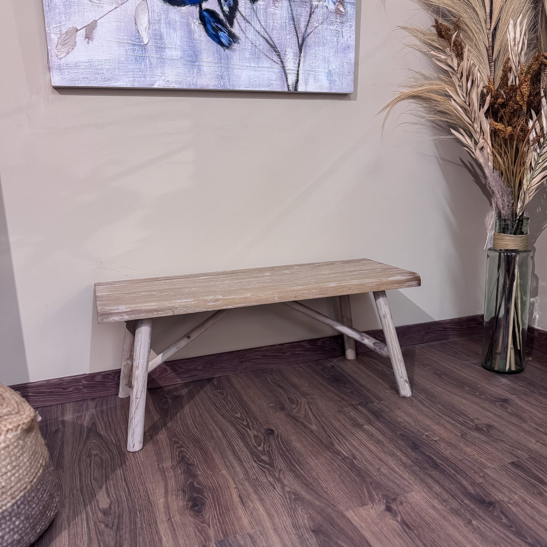 Gracias a su tamaño equilibrado, este banqueta de madera es ideal para ubicarse en el recibidor, funcionando como un cómodo apoyo al entrar en casa, o como pie de cama para completar la decoración del dormitorio con un toque mediterráneo. También es una solución perfecta para zonas de paso o salones, donde puede utilizarse tanto de asiento extra como de superficie para colocar libros, mantas o cojines decorativos. Su acabado natural permite que se integre sin esfuerzo en ambientes de estilo nórdico, rústico o boho chic, aportando esa conexión con la naturaleza que define el carácter de un hogar acogedor y lleno de vida.