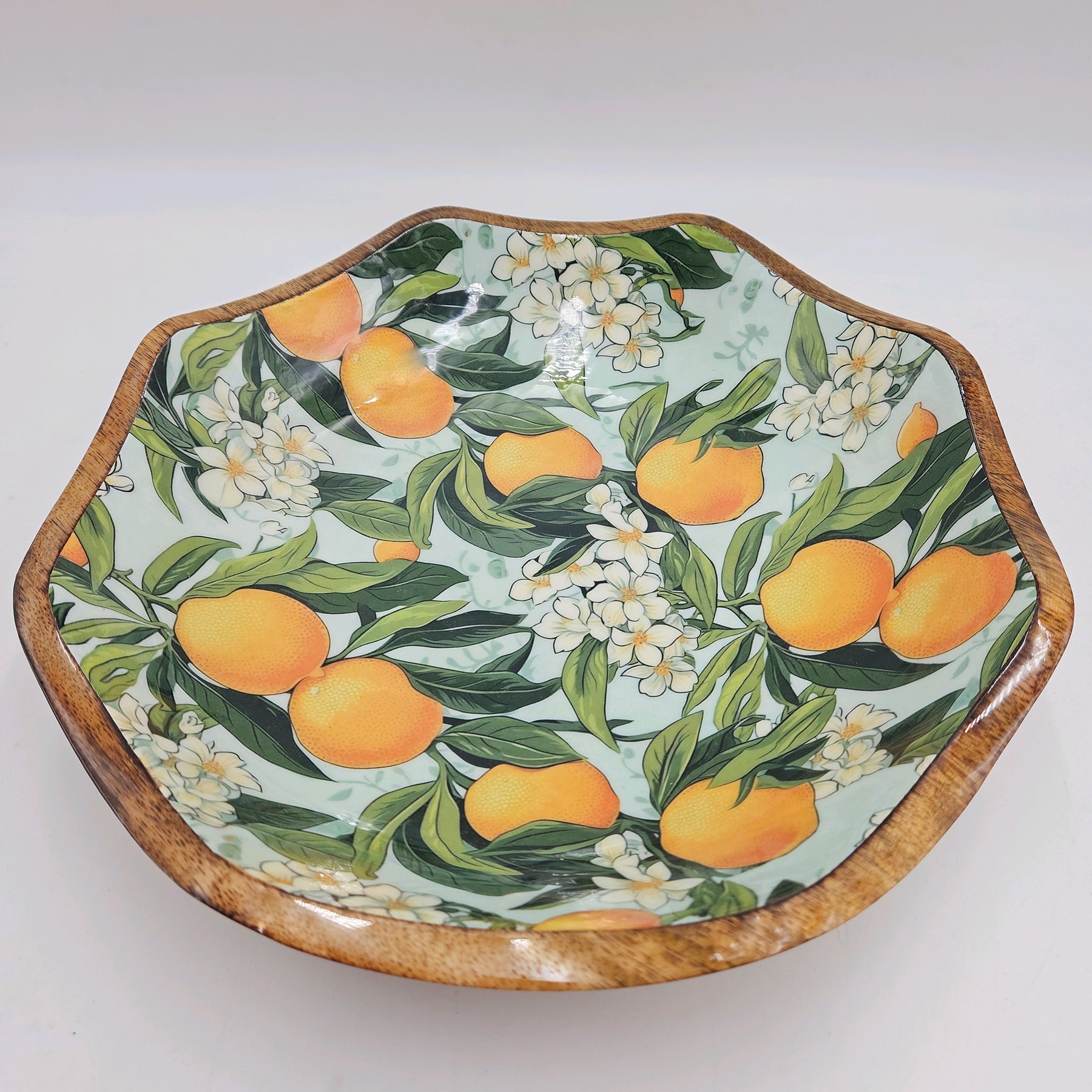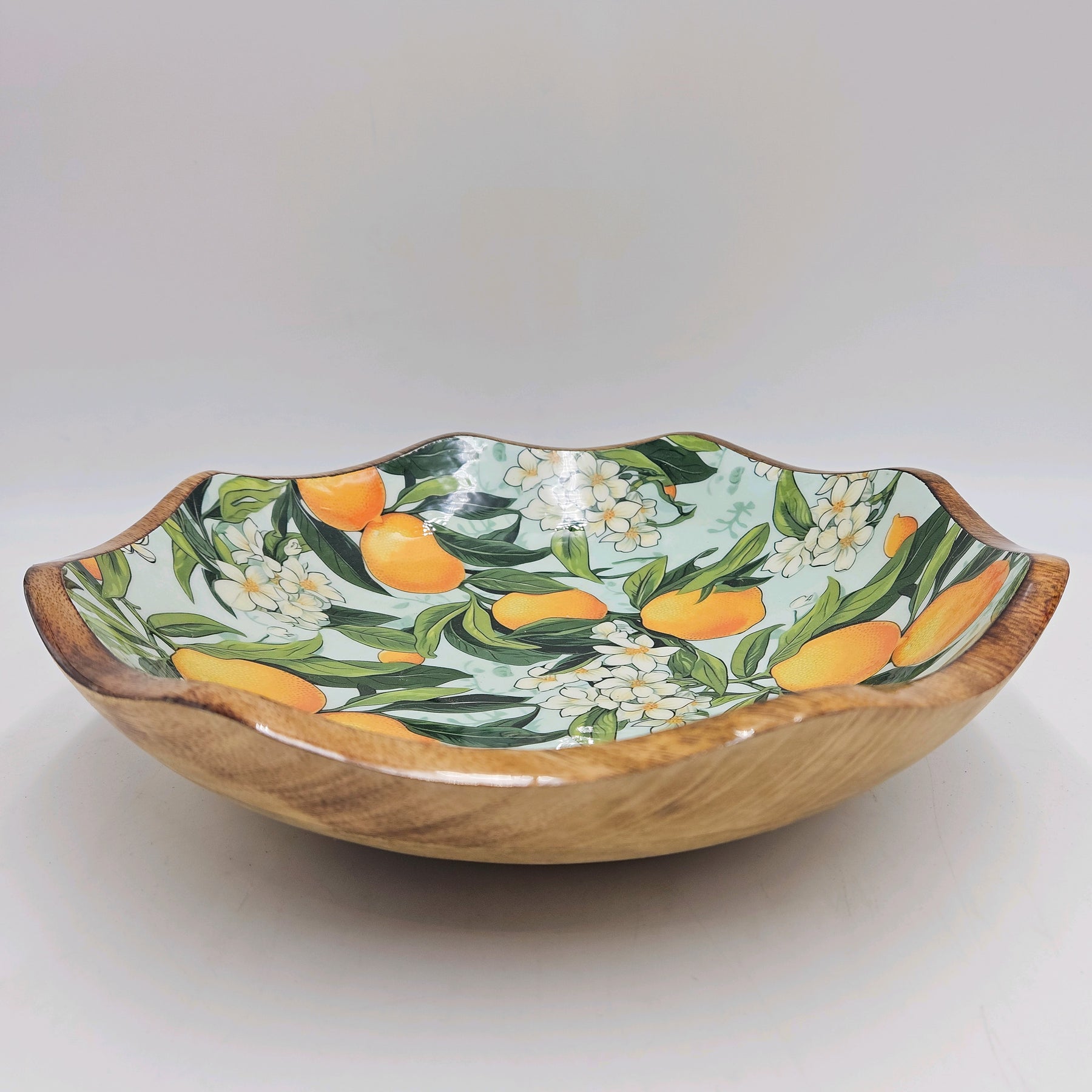 Este plato decorativo de madera de mango esmaltado es una pieza que aporta frescura, color y un marcado aire mediterráneo a tu mesa . Su interior esmaltado está decorado con un delicado motivo de naranjas y flores, que evoca la luz y la alegría del sur, mientras que el exterior en madera natural deja ver las vetas y la calidez característica de la madera de mango. Una combinación equilibrada entre artesanía y diseño decorativo que llena el espacio de personalidad.
