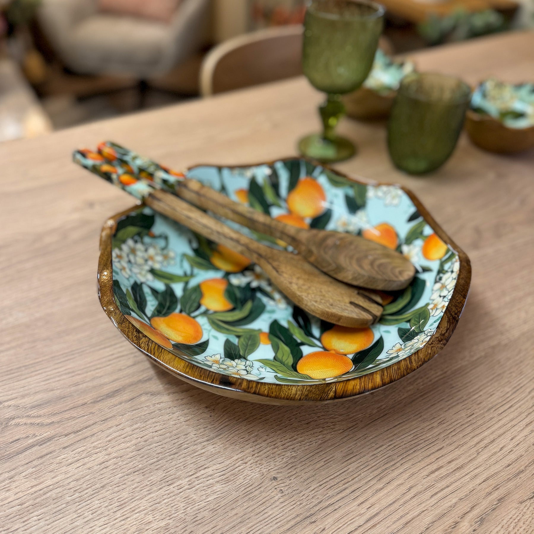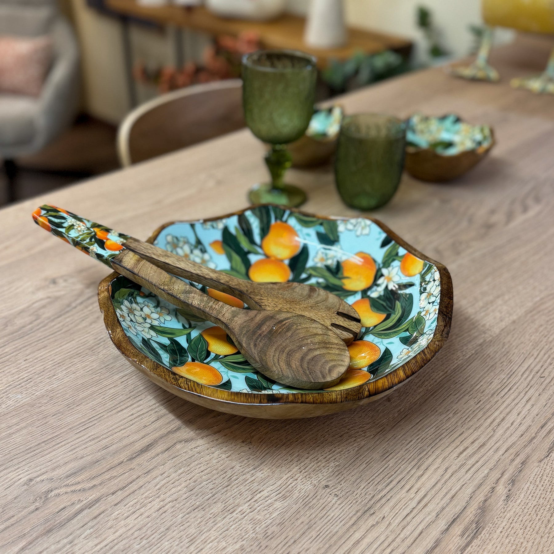 Este bol de madera de mango esmaltado con naranjas es ideal para dar un toque natural, alegre y acogedor a tu casa. Una pieza funcional y decorativa que encaja a la perfección en ambientes mediterráneos, rústicos o boho, pensada para acompañarte en el día a día y llenar tu hogar de encanto. No incluye los cubiertos, añádelos para tener una mesa de revista.