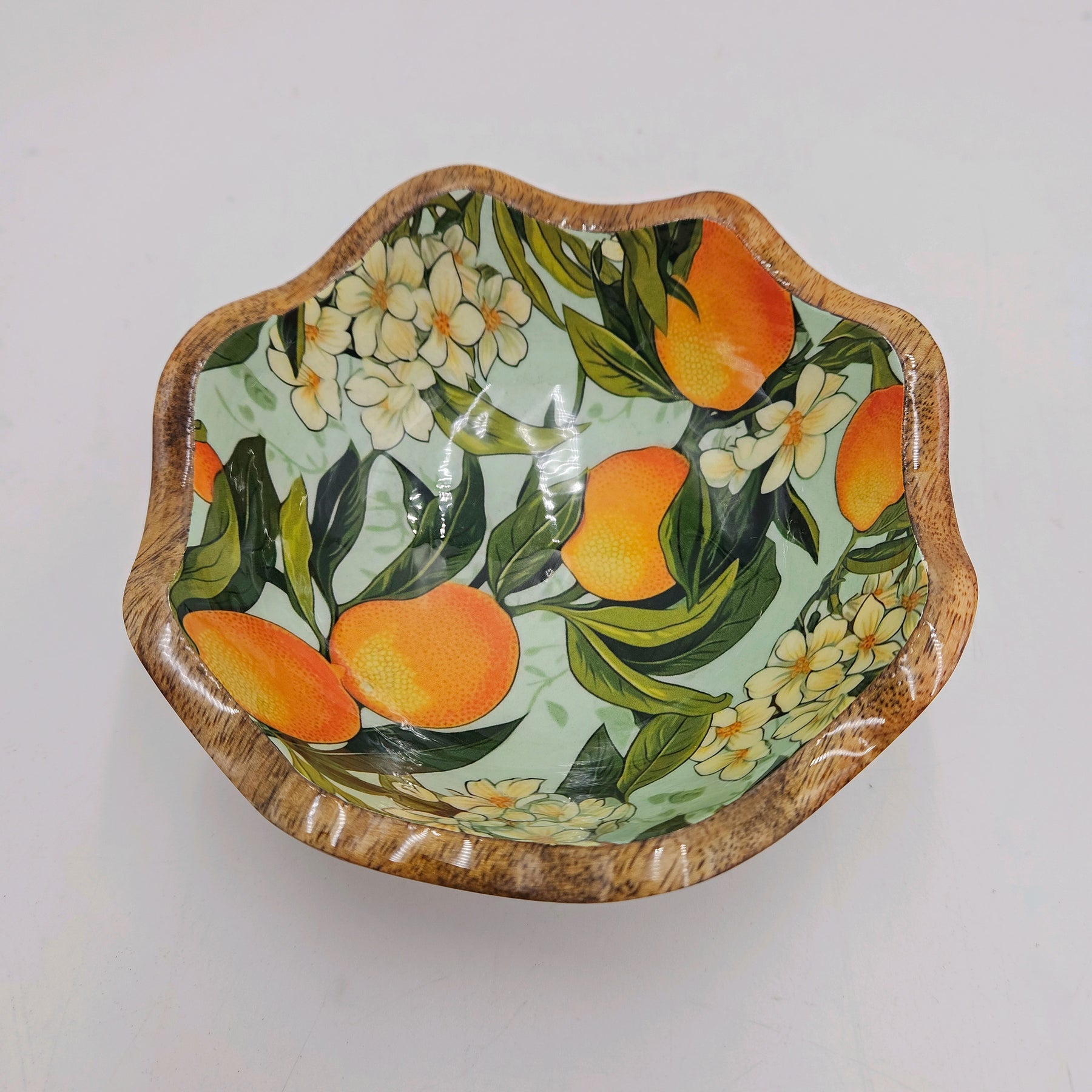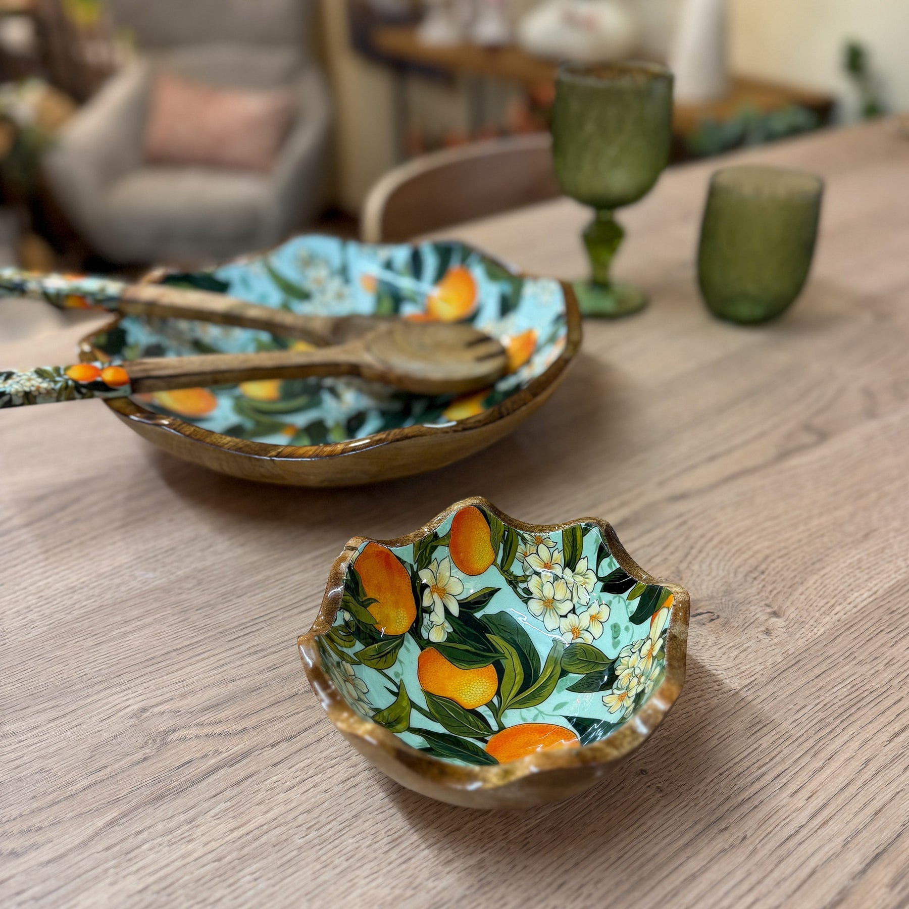 Este cuenco de madera de mango lacada destaca por su interior estampado con naranjas, un diseño luminoso que evoca los paisajes mediterráneos y añade una nota alegre a tu mesa. Su acabado artesanal y su forma ondulada suave lo convierten en una pieza tan decorativa como práctica.
