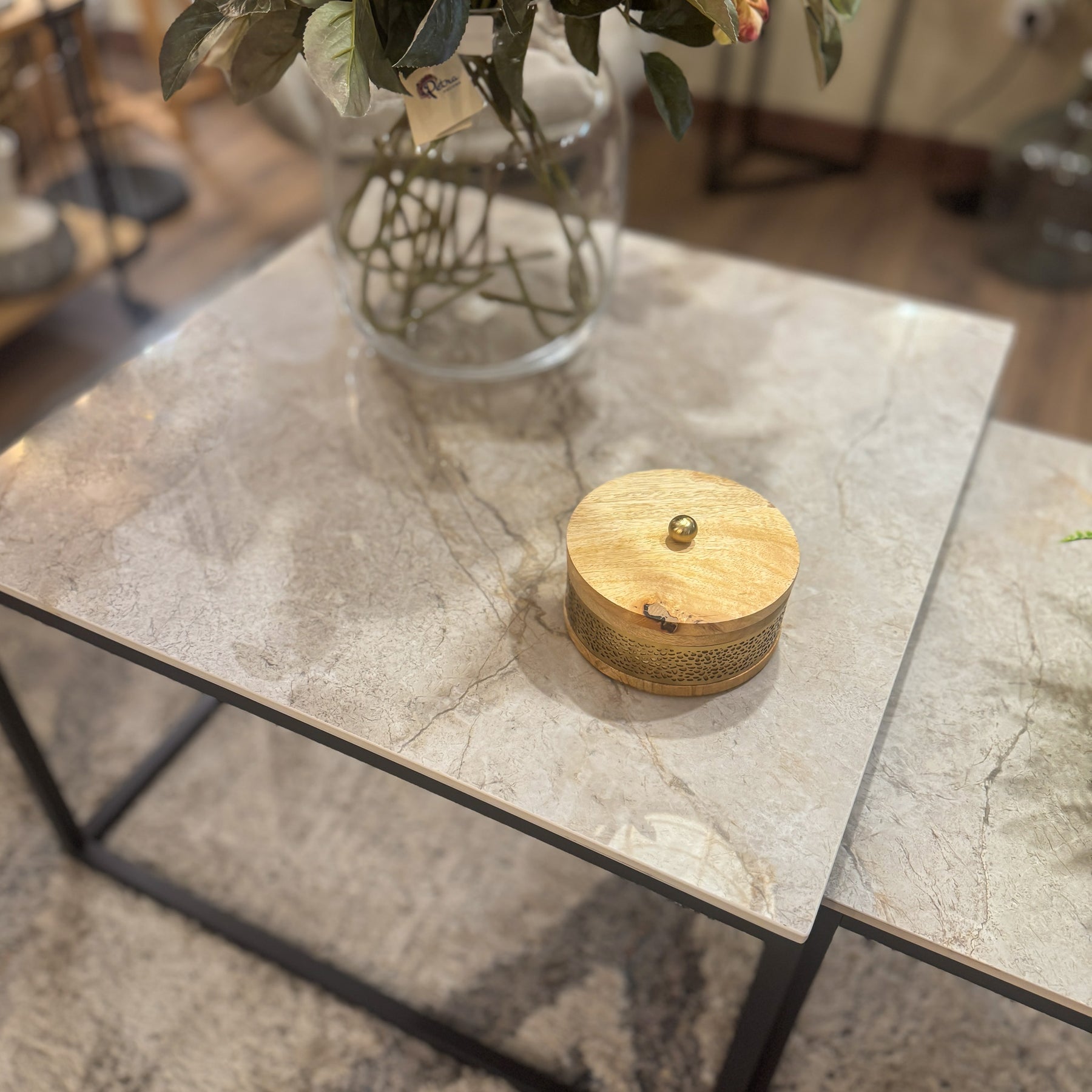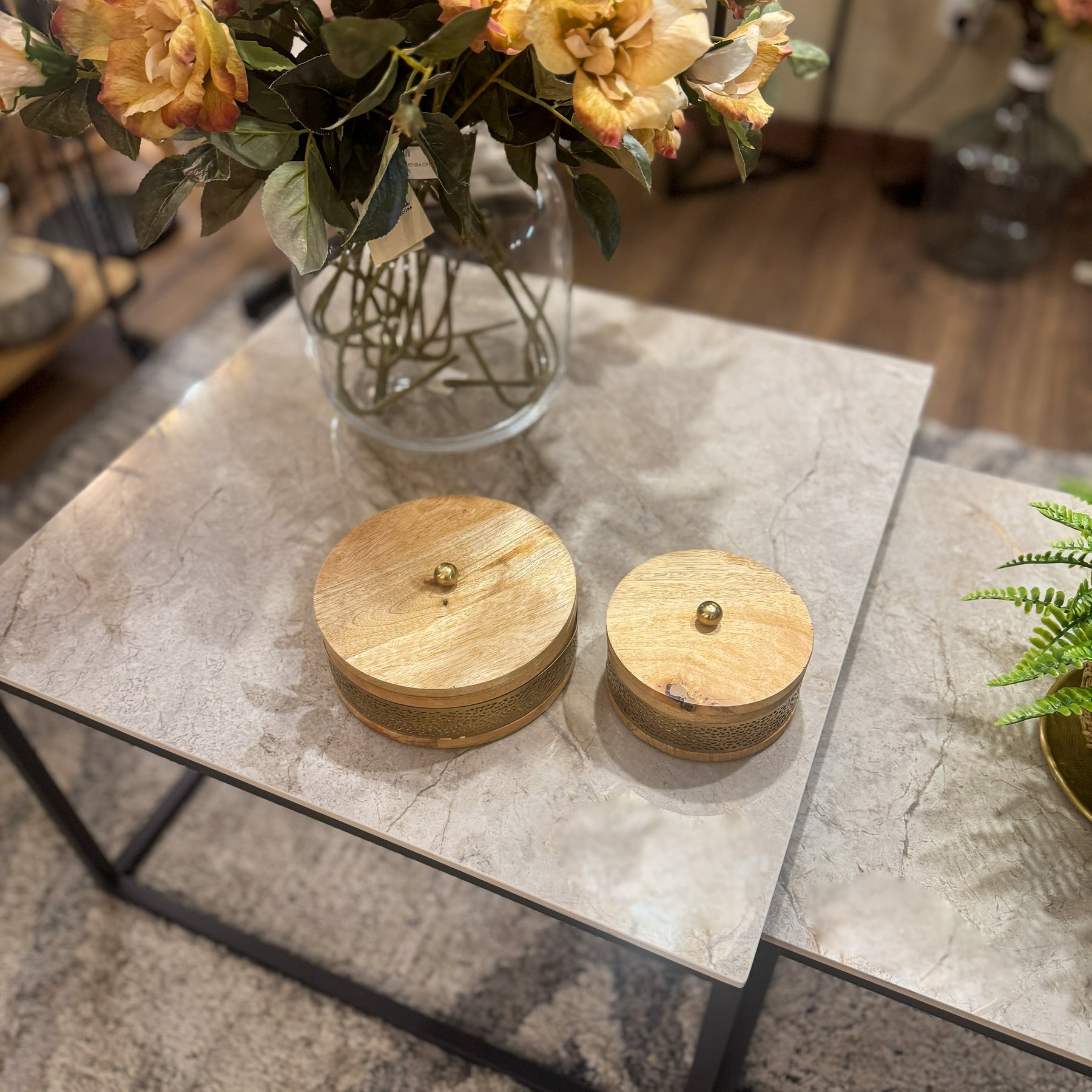 Una caja redonda con tapa, coronada por un pequeño tirador metálico, que resalta la belleza de la sencillez. Fabricada con materiales de calidad, esta caja de madera natural no solo añade funcionalidad, sino que también enriquece visualmente el ambiente, funcionando como un elemento clave en el styling de mesas de centro o escritorios. La combinación de materiales y texturas la hace encajar perfectamente en decoraciones nórdicas, étnicas o de estilo boho.
