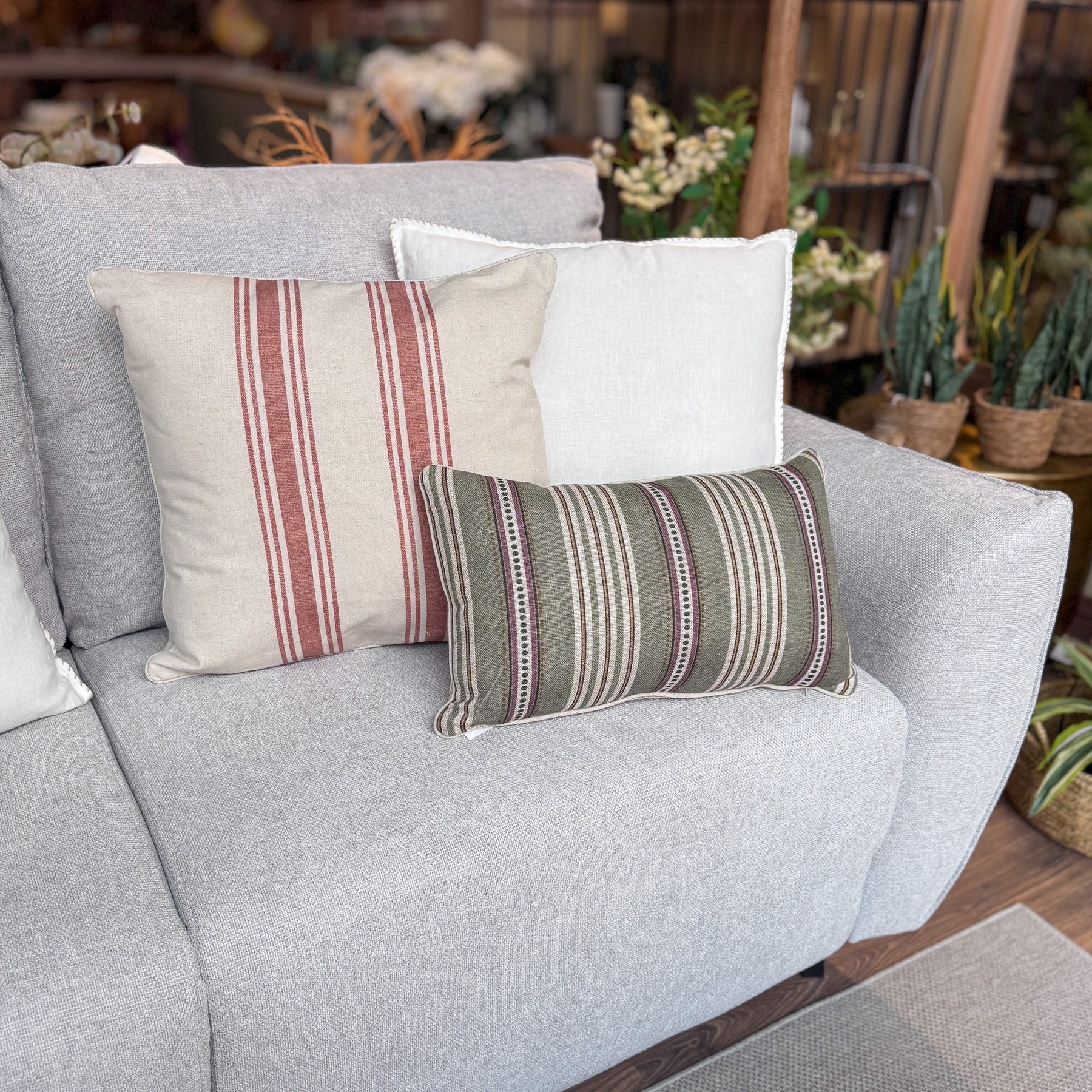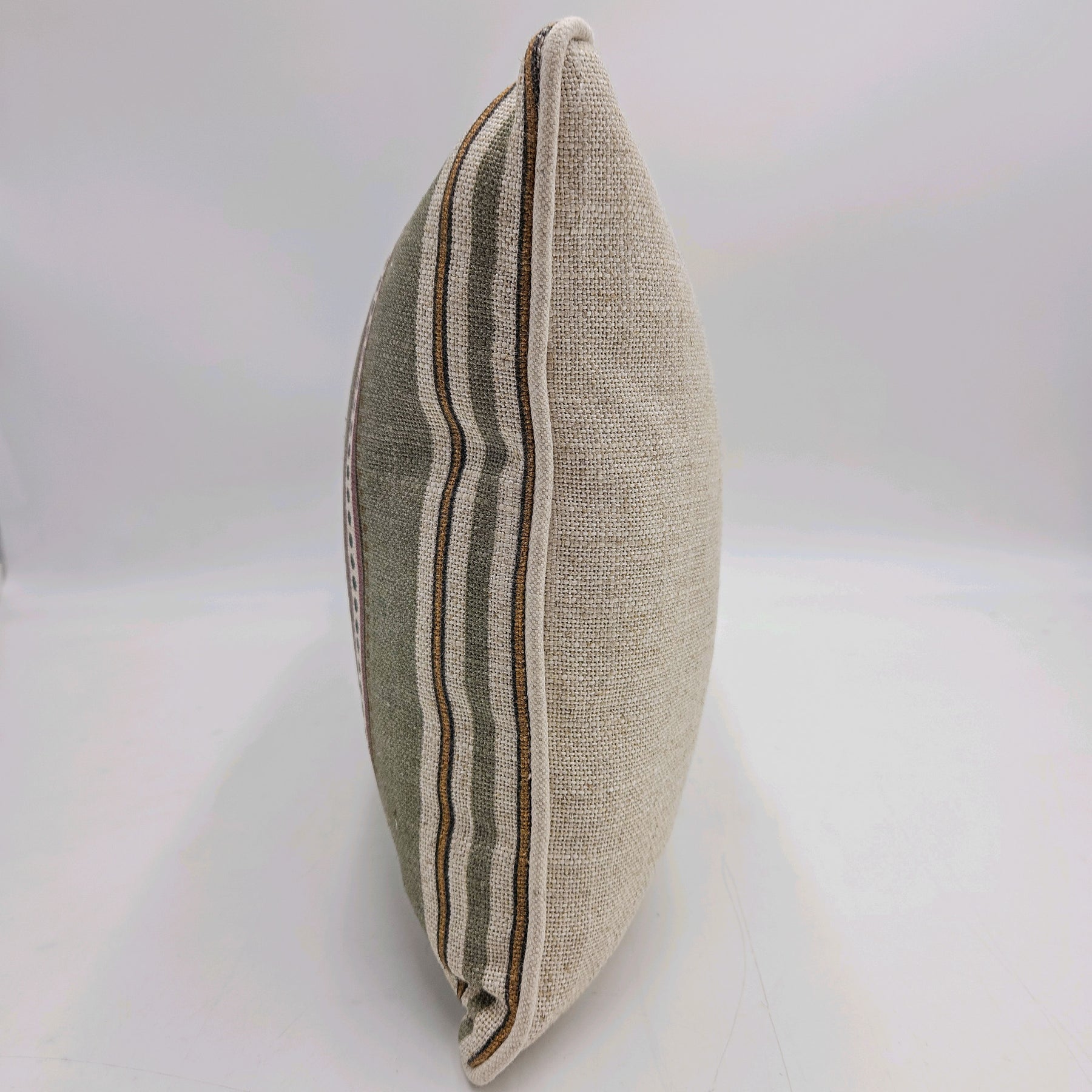 Un cojín de rayas que presenta un diseño estampado clásico de rayas verticales que intercala tonos verde oliva, crudo y detalles en granate. Está rematado con un ribete perimetral que refuerza sus costuras y le ayuda a mantener la forma. Al estar confeccionado en lino, aporta un tacto fresco y un aspecto natural a la estancia.
