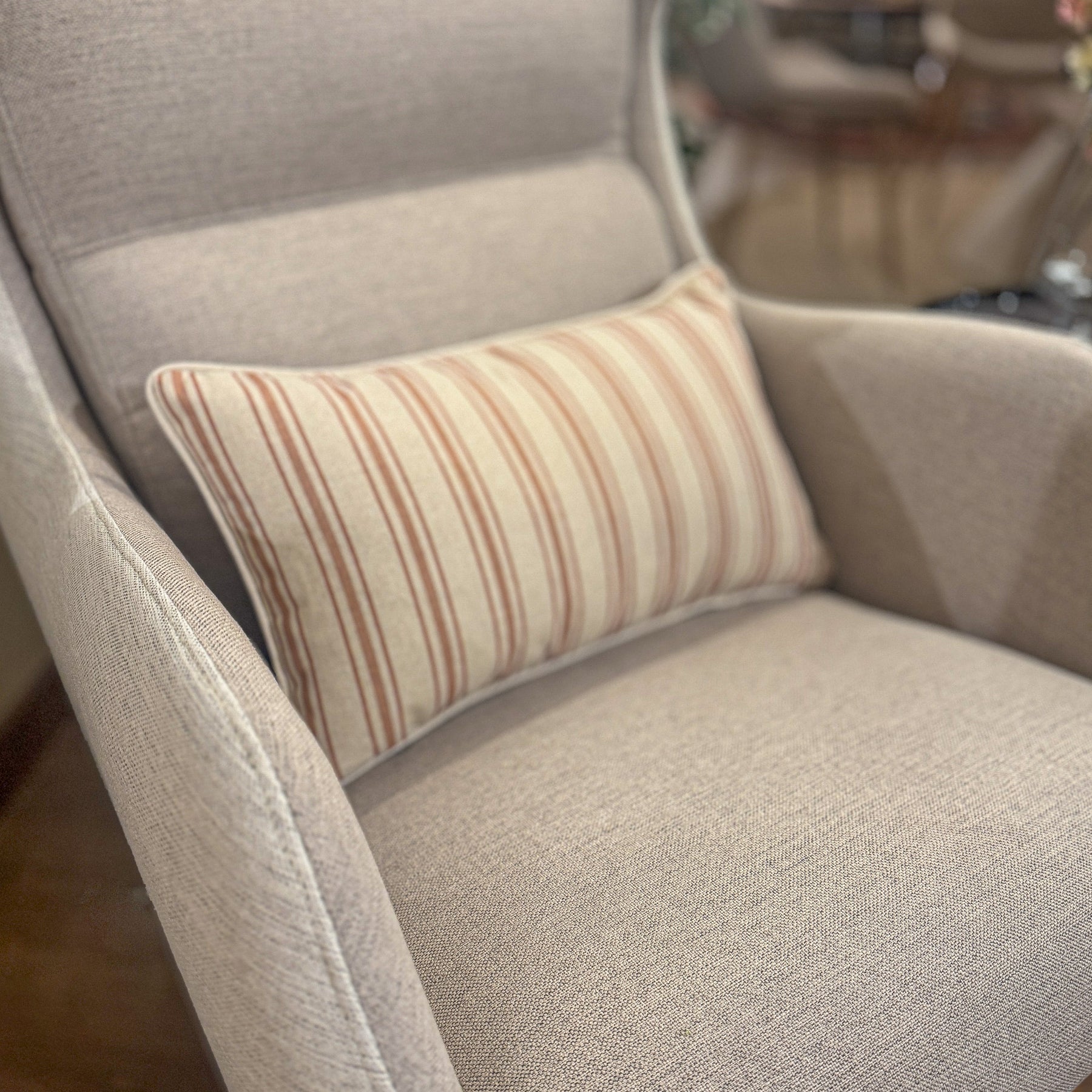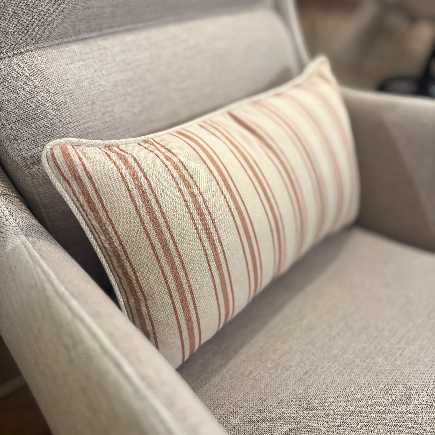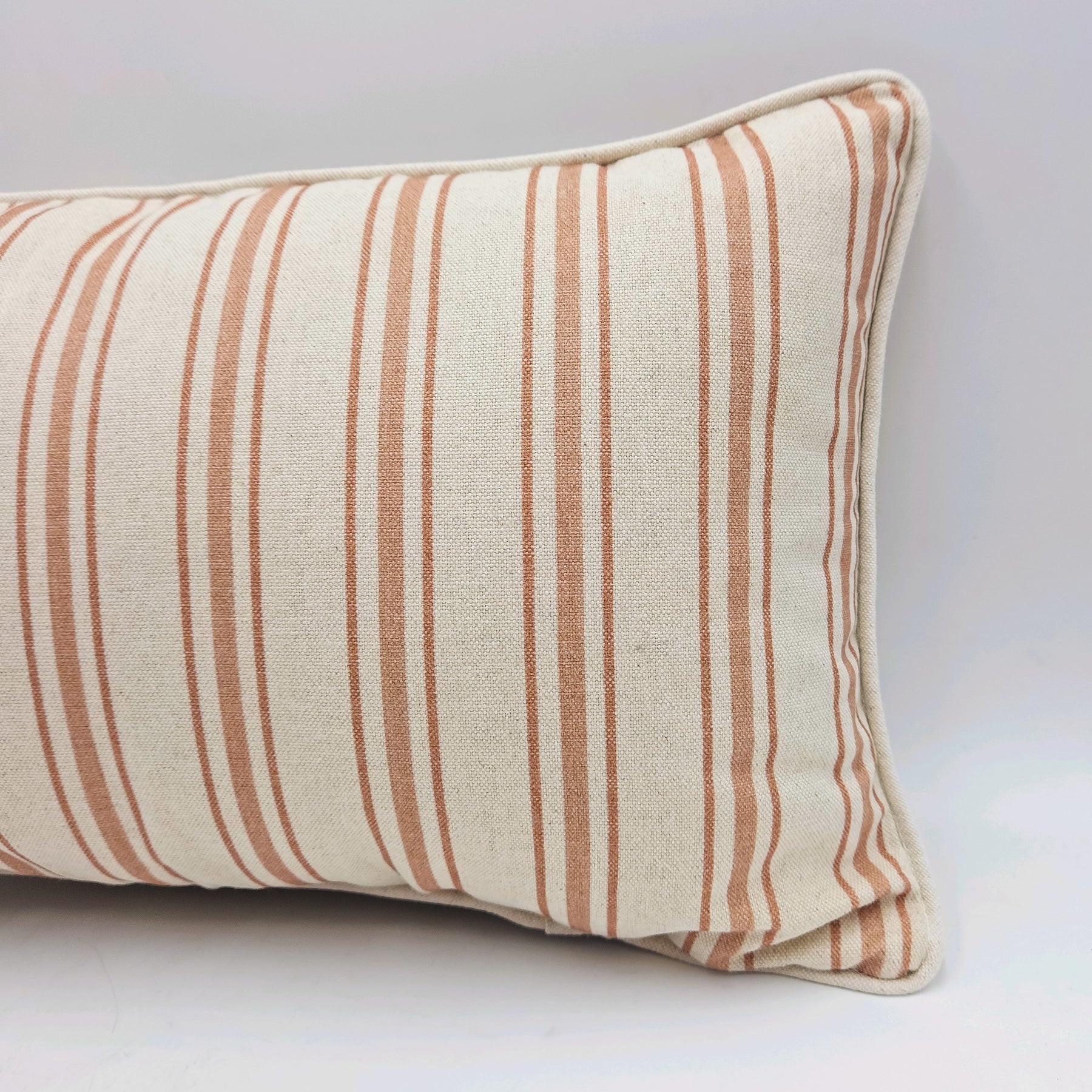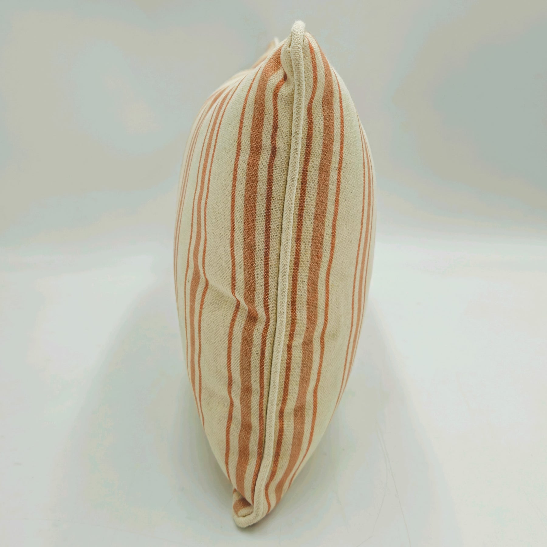 Aporta calidez y suavidad con este cojín de lino natural de 30x50 cm, la pieza clave para un rincón lleno de encanto. Su diseño destaca por su elegante patrón de rayas finas en tonos beige y granate (terracota), una paleta cromática de la tierra que transforma la atmósfera de tu salón o butaca.