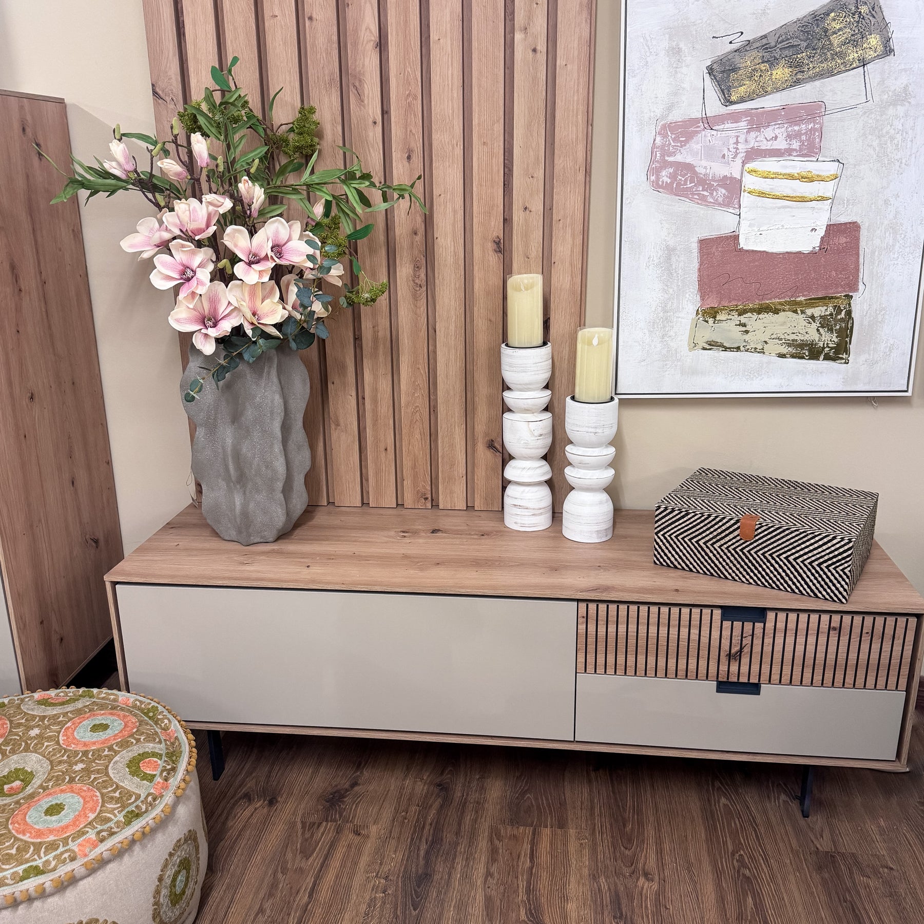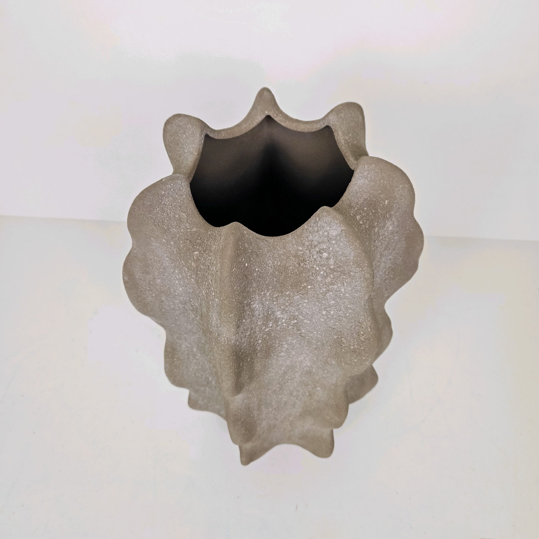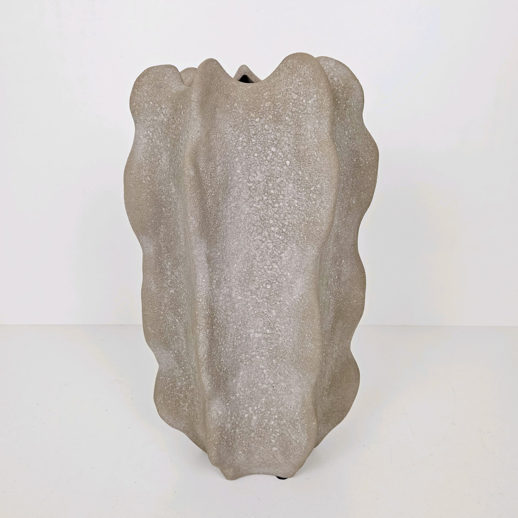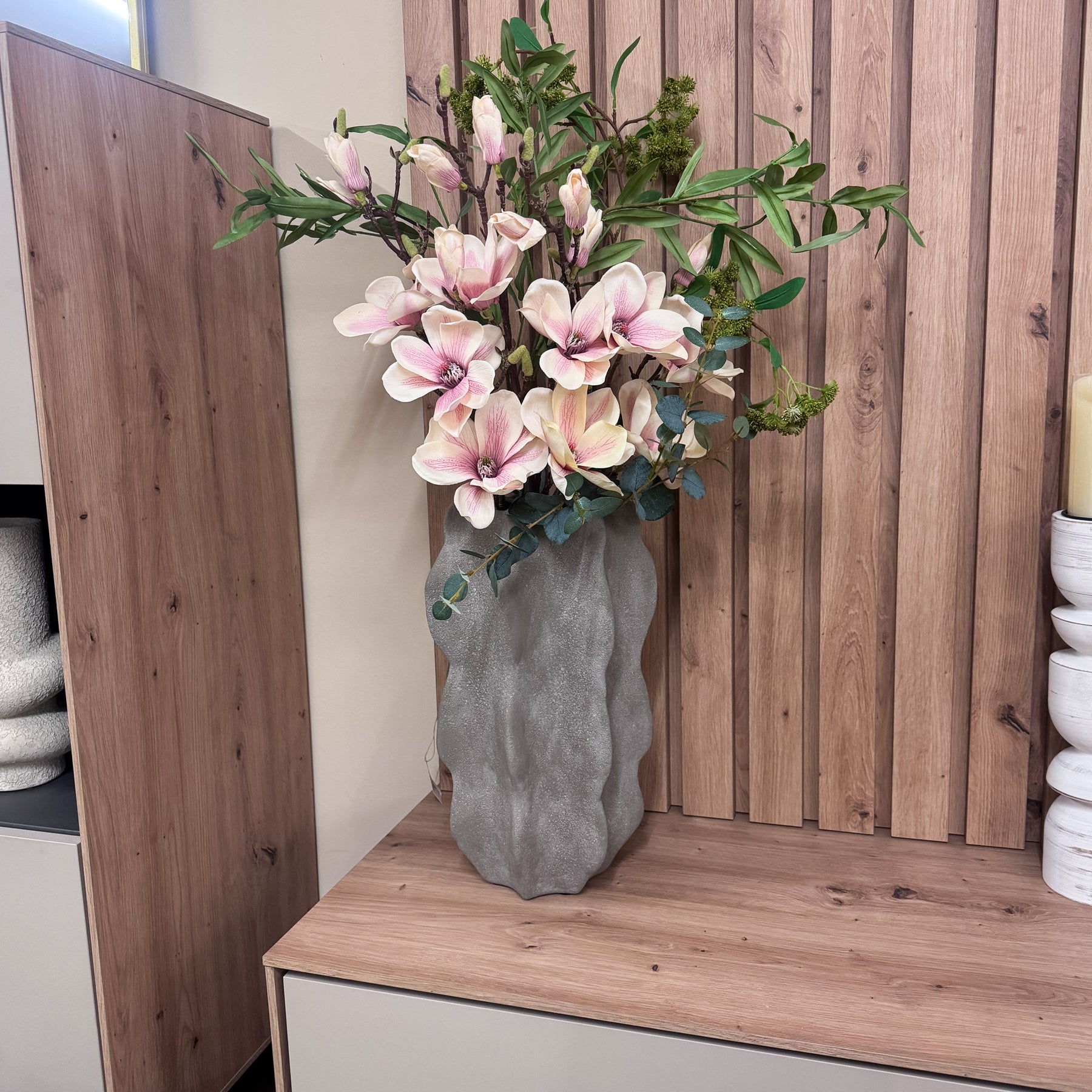 Su tonalidad neutra y terrosa lo convierte en un elemento decorativo muy versátil, capaz de integrarse con naturalidad en ambientes de estilo wabi-sabi, industrial o rústico moderno. Gracias a su tamaño, es un jarrón perfecto para colocarse directamente en el suelo junto a un aparador o como pieza central en una mesa de entrada amplia, funcionando maravillosamente con ramas altas de magnolia o pampas que realcen su verticalidad.