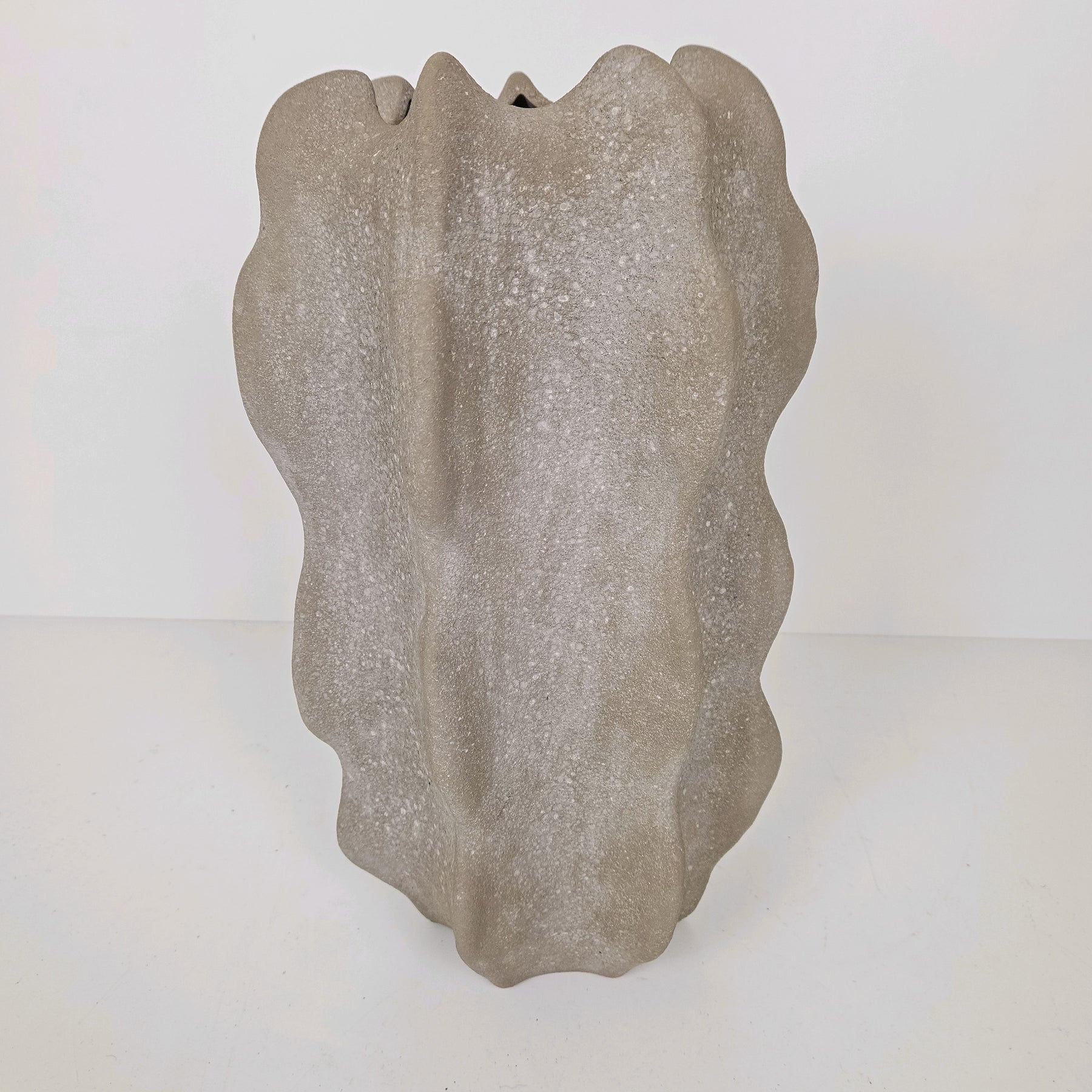Este jarrón de cerámica es la pieza ideal para quienes buscan añadir volumen y carácter a cualquier estancia. Con una altura de 45 cm y un diámetro de 23 cm, su diseño de silueta orgánica y relieve ondulado aporta un dinamismo visual que captura la luz de forma suave, resaltando su acabado mate.