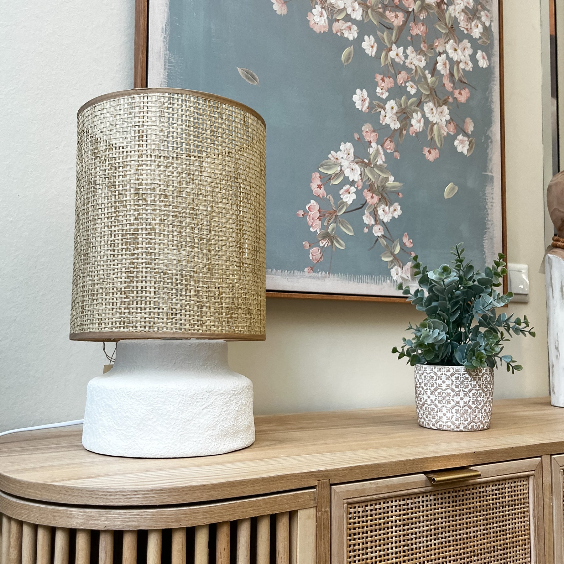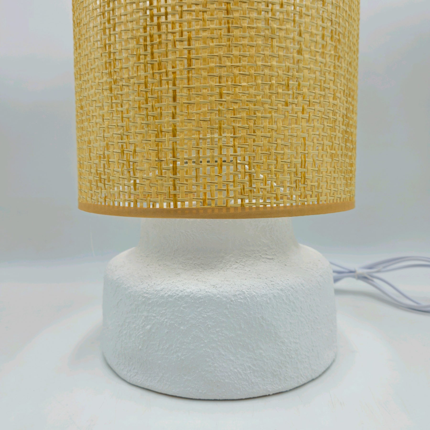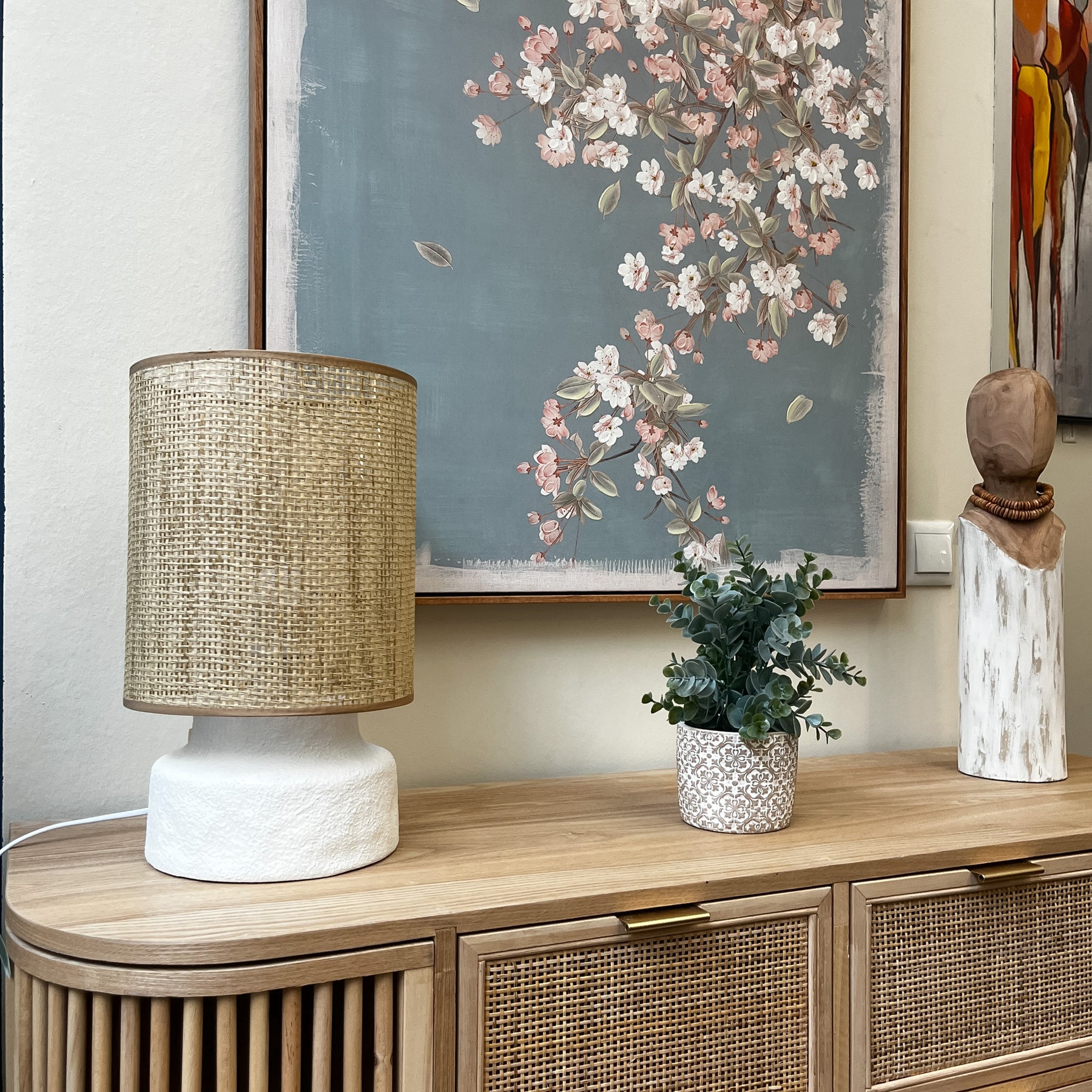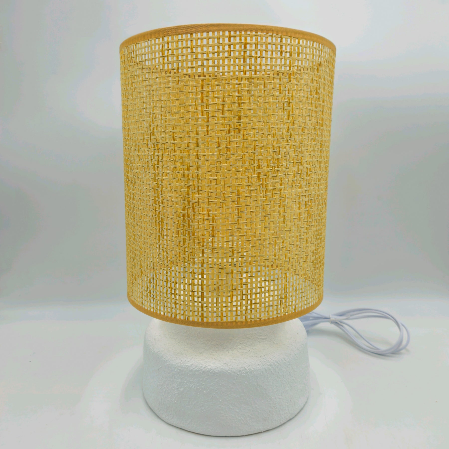 Esta lámpara de sobremesa combina una base de cerámica blanca con una pantalla de fibras naturales, creando una pieza que aporta calidez y estilo a cualquier espacio. Su diseño sencillo y materiales naturales la hacen perfecta para dormitorios, salones o rincones de lectura. Una lámpara de sobremesa de 23x20x39 cm, ideal para generar una iluminación suave y acogedora, convirtiéndose en un complemento decorativo funcional y versátil.