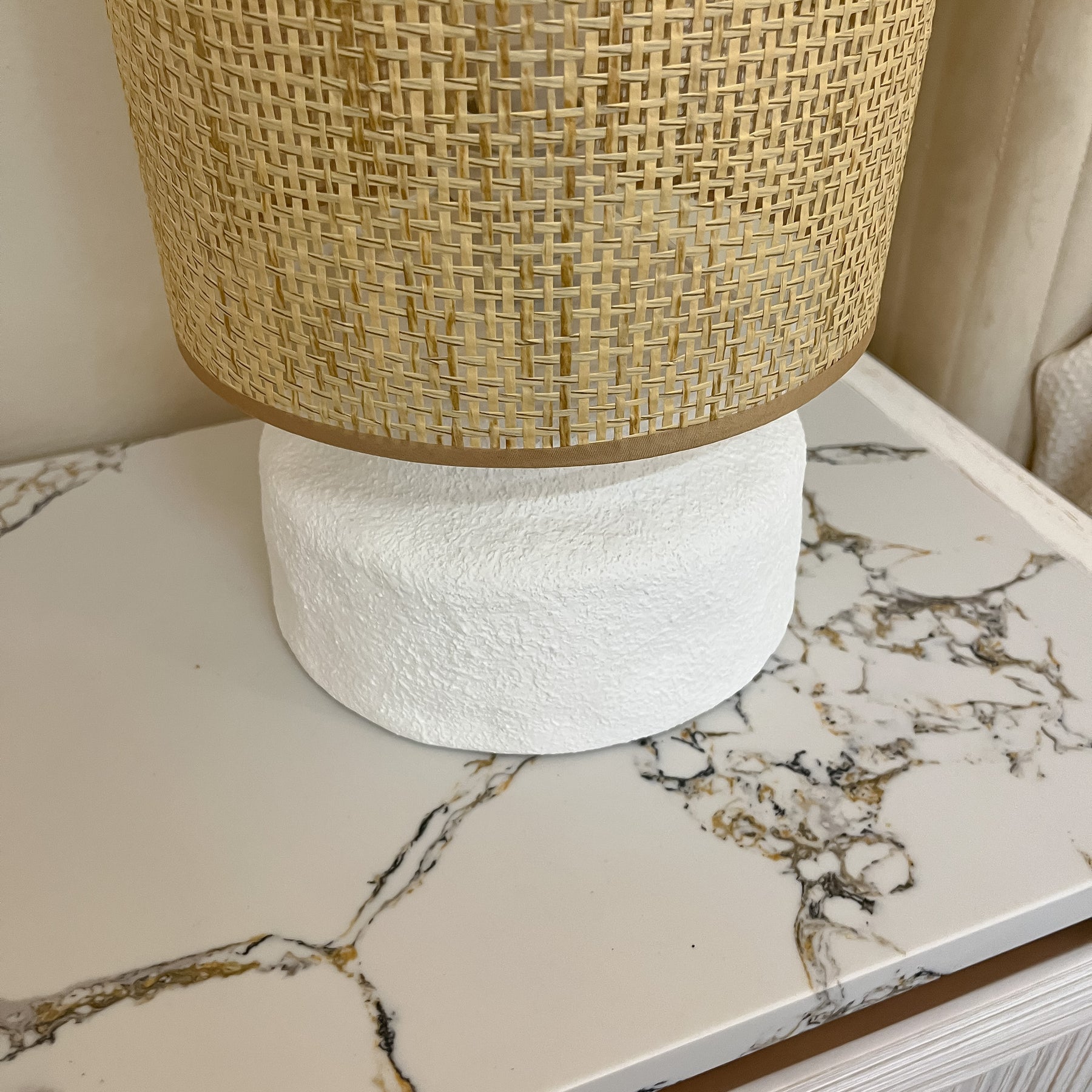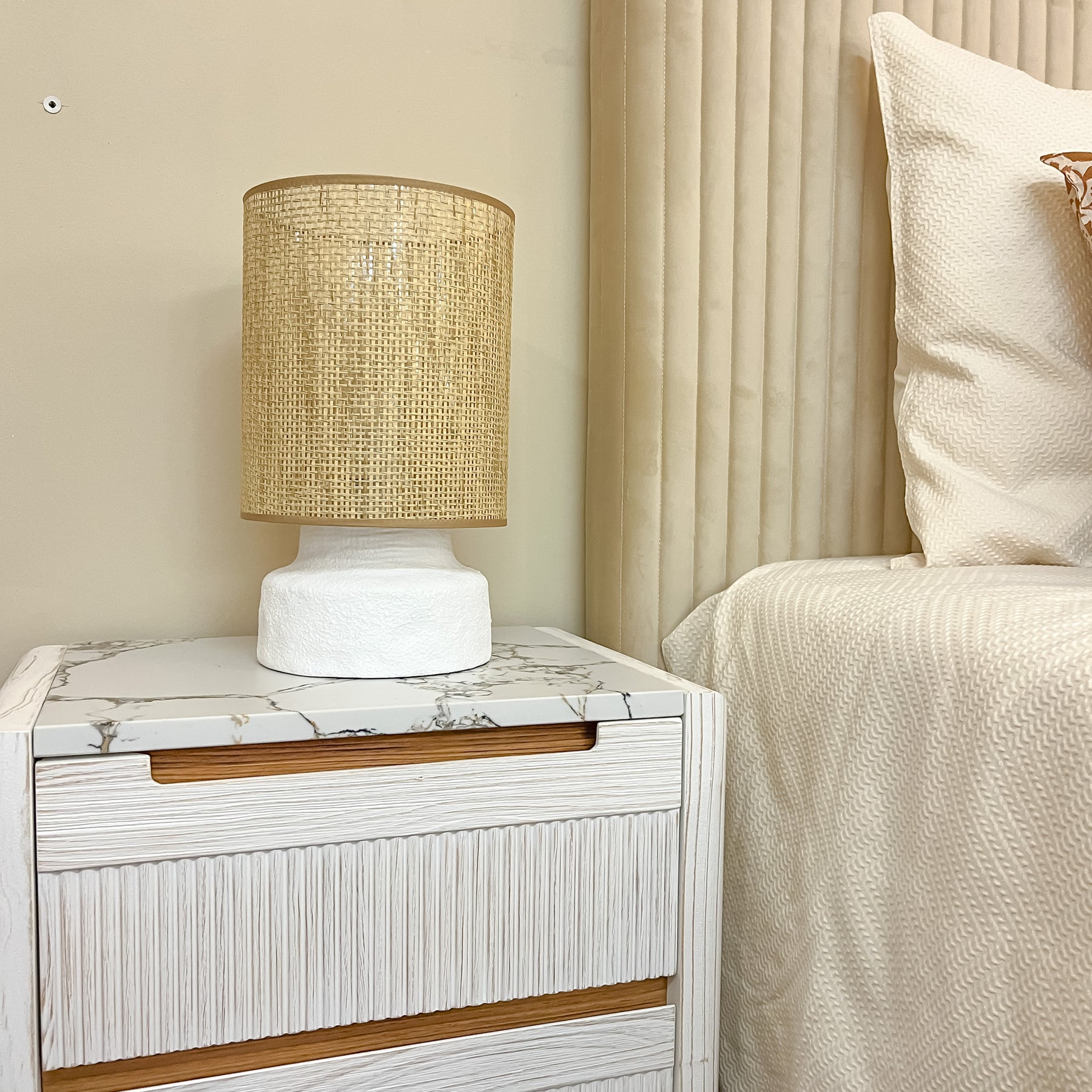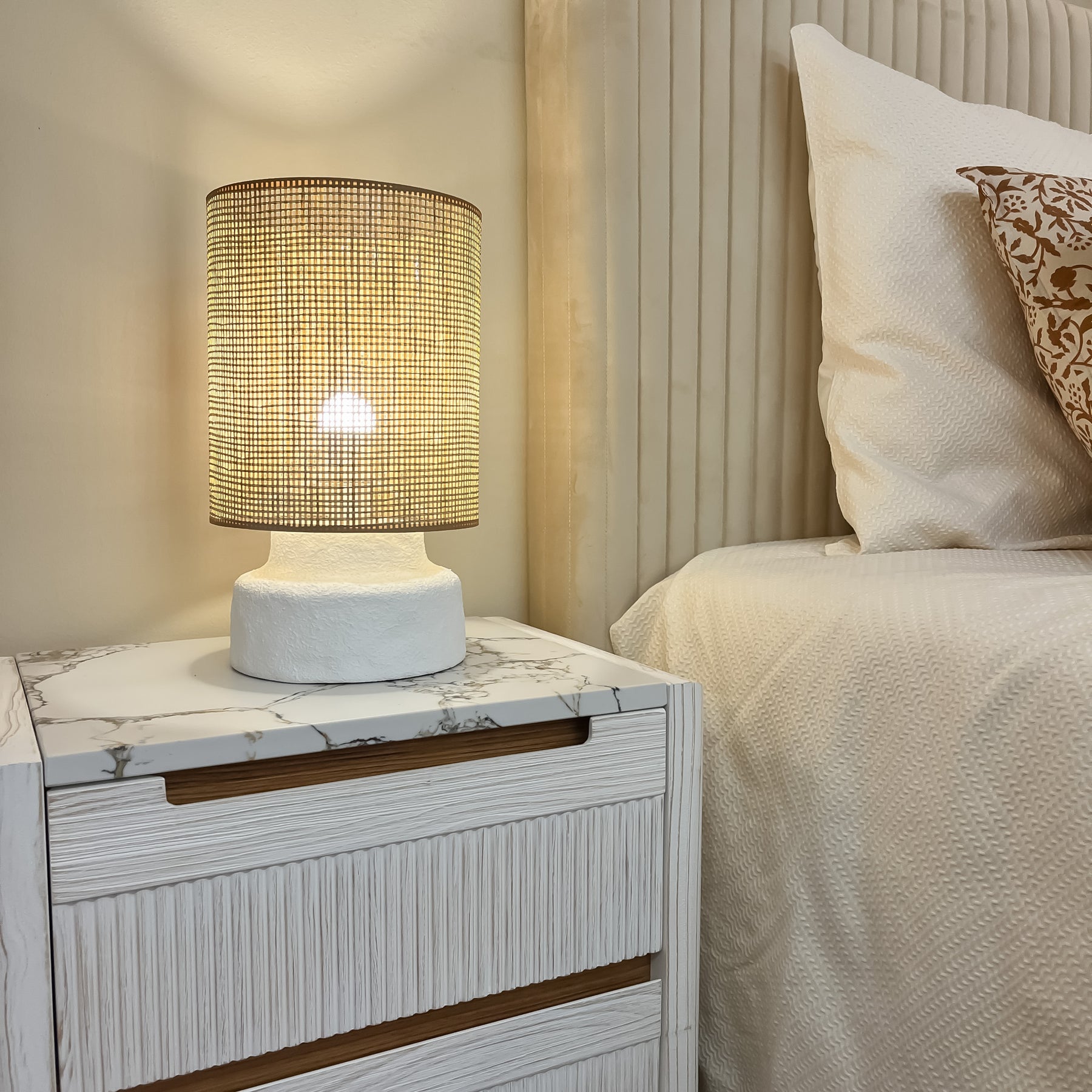 Esta lámpara de sobremesa combina una base de cerámica blanca con una pantalla de fibras naturales, creando una pieza que aporta calidez y estilo a cualquier espacio. Su diseño sencillo y materiales naturales la hacen perfecta para dormitorios, salones o rincones de lectura. Una lámpara de sobremesa de 23x20x39 cm, ideal para generar una iluminación suave y acogedora, convirtiéndose en un complemento decorativo funcional y versátil.