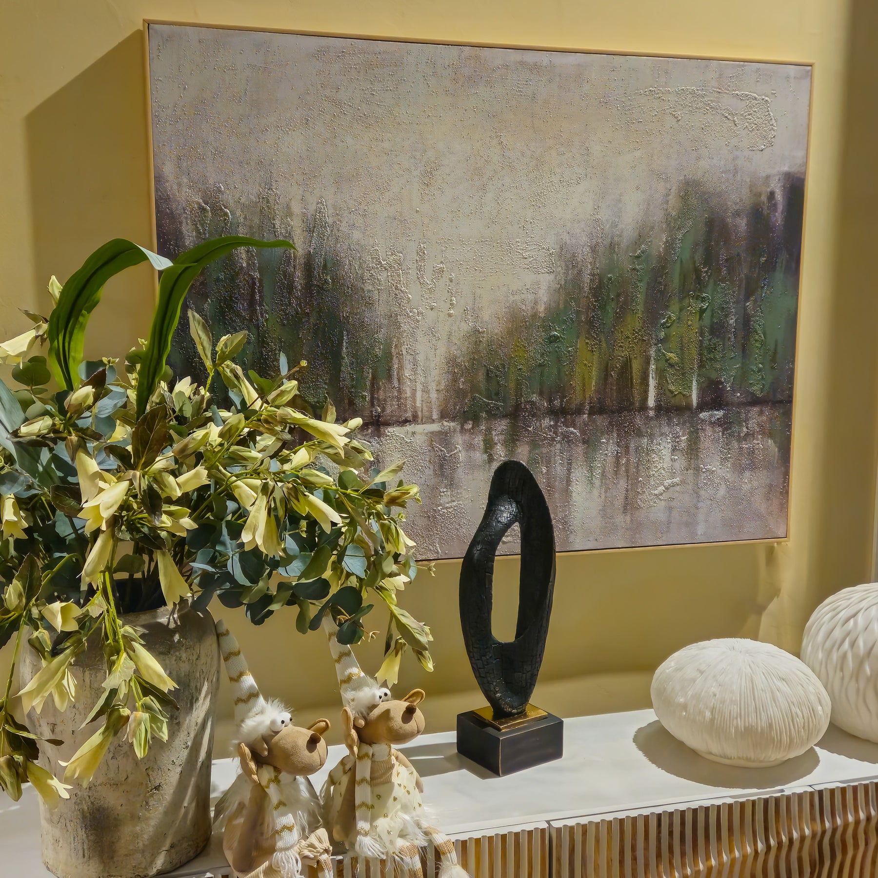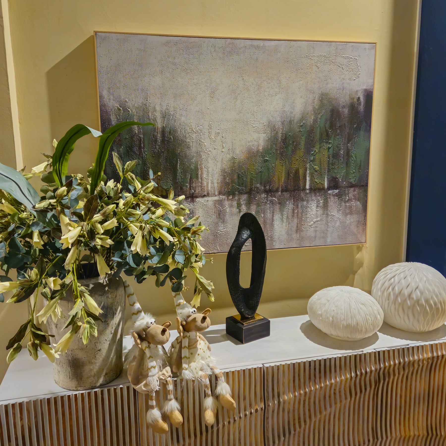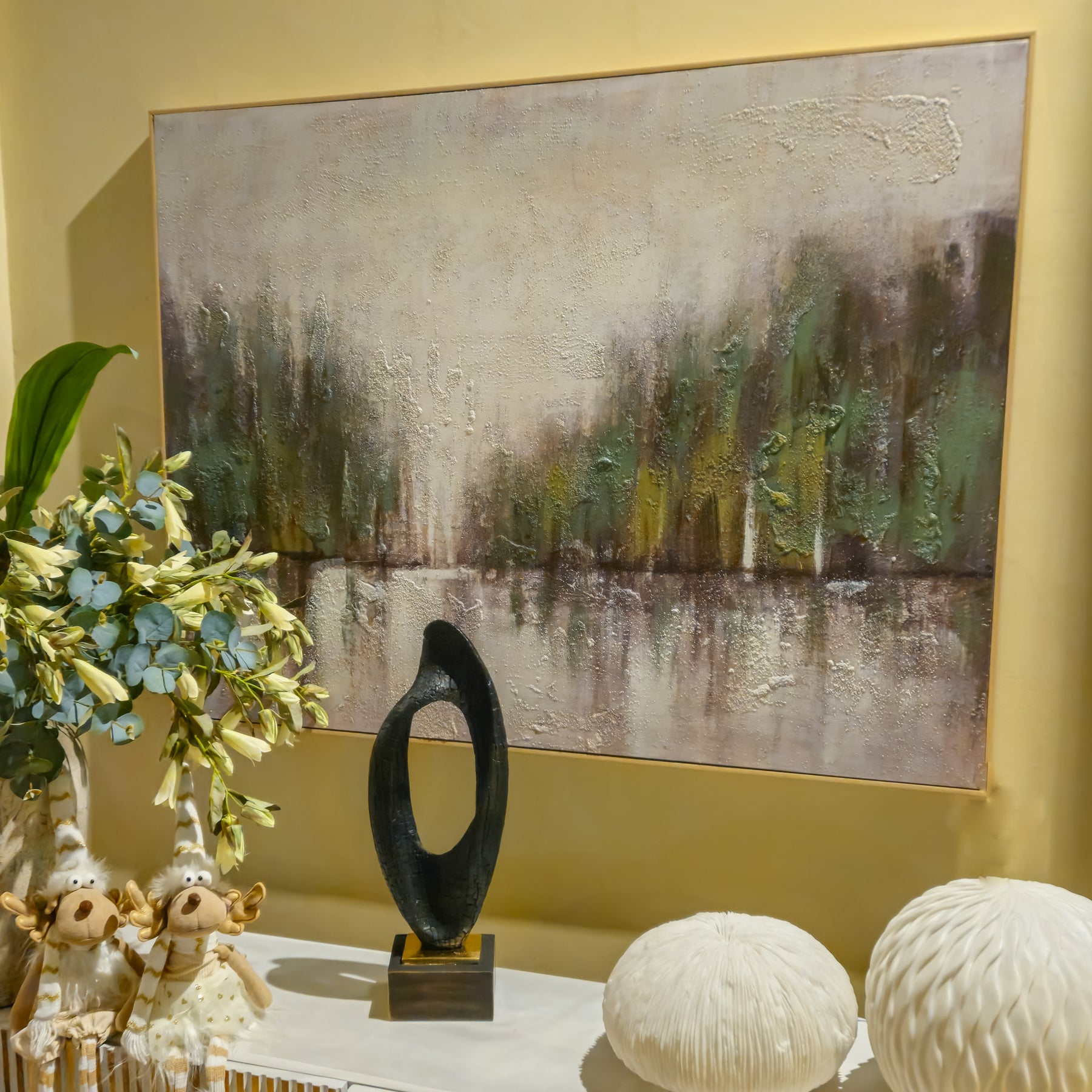 Este lienzo abstracto es la pieza central perfecta para transformar cualquier pared de tu hogar, añadiendo una atmósfera de calma y sofisticación atemporal. Con unas dimensiones de 92x122 cm, este lienzo abstracto evoca un paisaje boscoso reflejado en aguas tranquilas, donde la línea del horizonte se difumina suavemente. La paleta de colores se centra en tonos neutros, verdes musgo y sutiles grises, creando una sensación de profundidad y serenidad ideal para un refugio de paz.