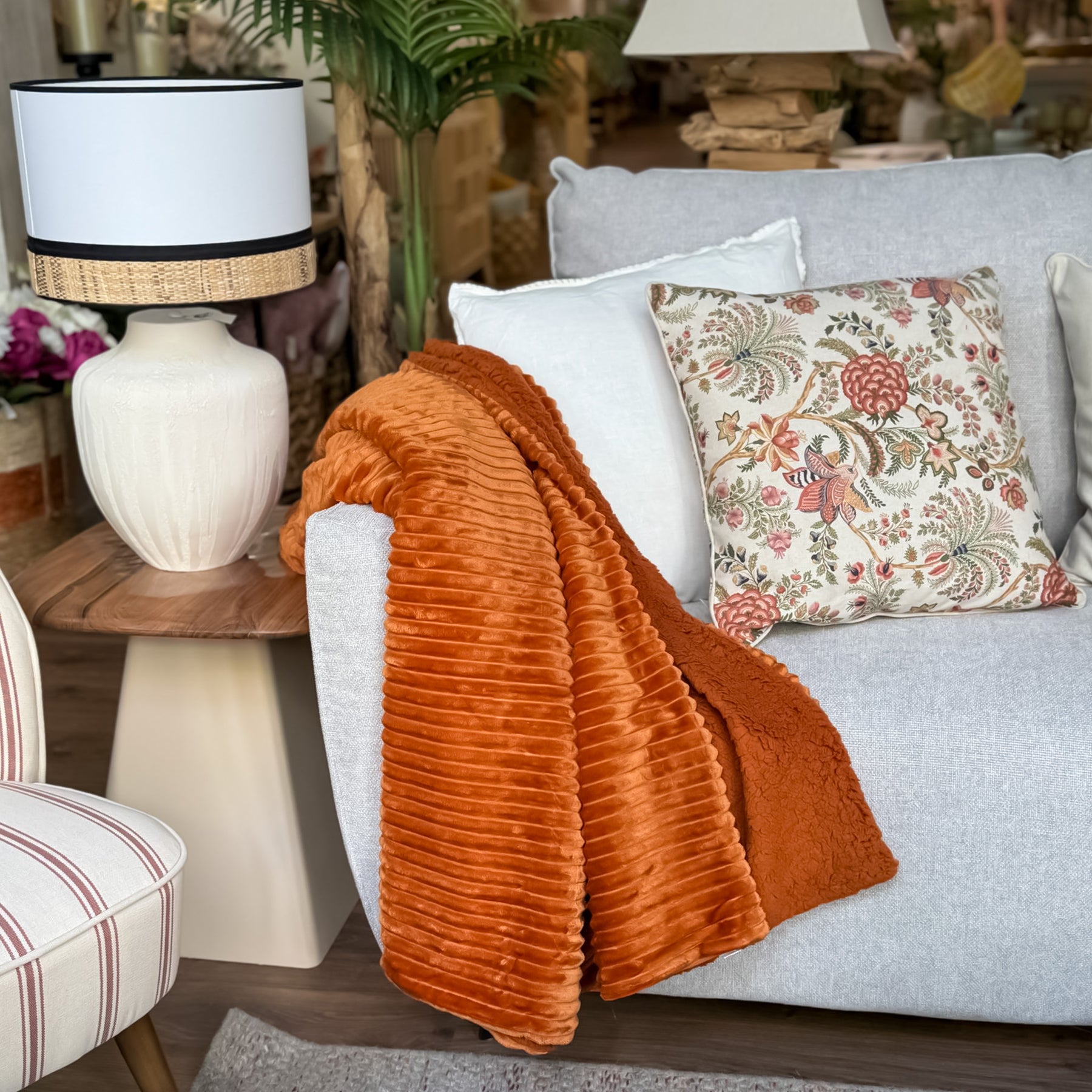 Con su textura suave y envolvente, esta manta en color terracota es una invitación al confort. Su cálido tono tierra anaranjado añade un toque natural y elegante al sofá, la cama o cualquier rincón donde quieras crear un ambiente acogedor.
