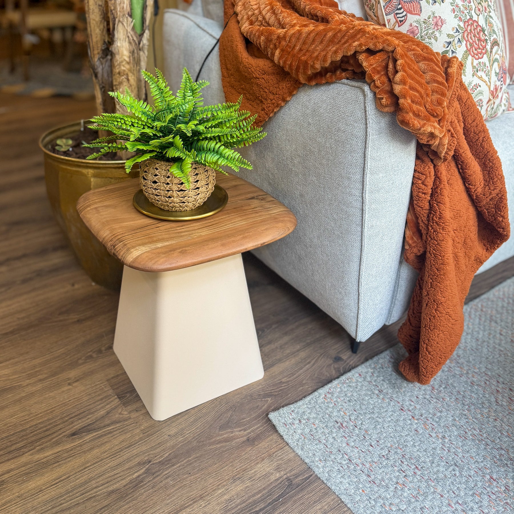 Esta mesa auxiliar de madera y metal de 50x50x52 cm se convierte en una pieza funcional y de diseño para cualquier salón que busque un toque orgánico y moderno. Su diseño combina la robustez de la base de metal en tono claro con la calidez de su superficie superior, fabricada en madera natural con un acabado que realza sus vetas únicas. Es la opción ideal como mesa auxiliar junto al sofá, proporcionando la altura perfecta para tener a mano tu bebida o ese libro que te acompaña en los momentos de relax.