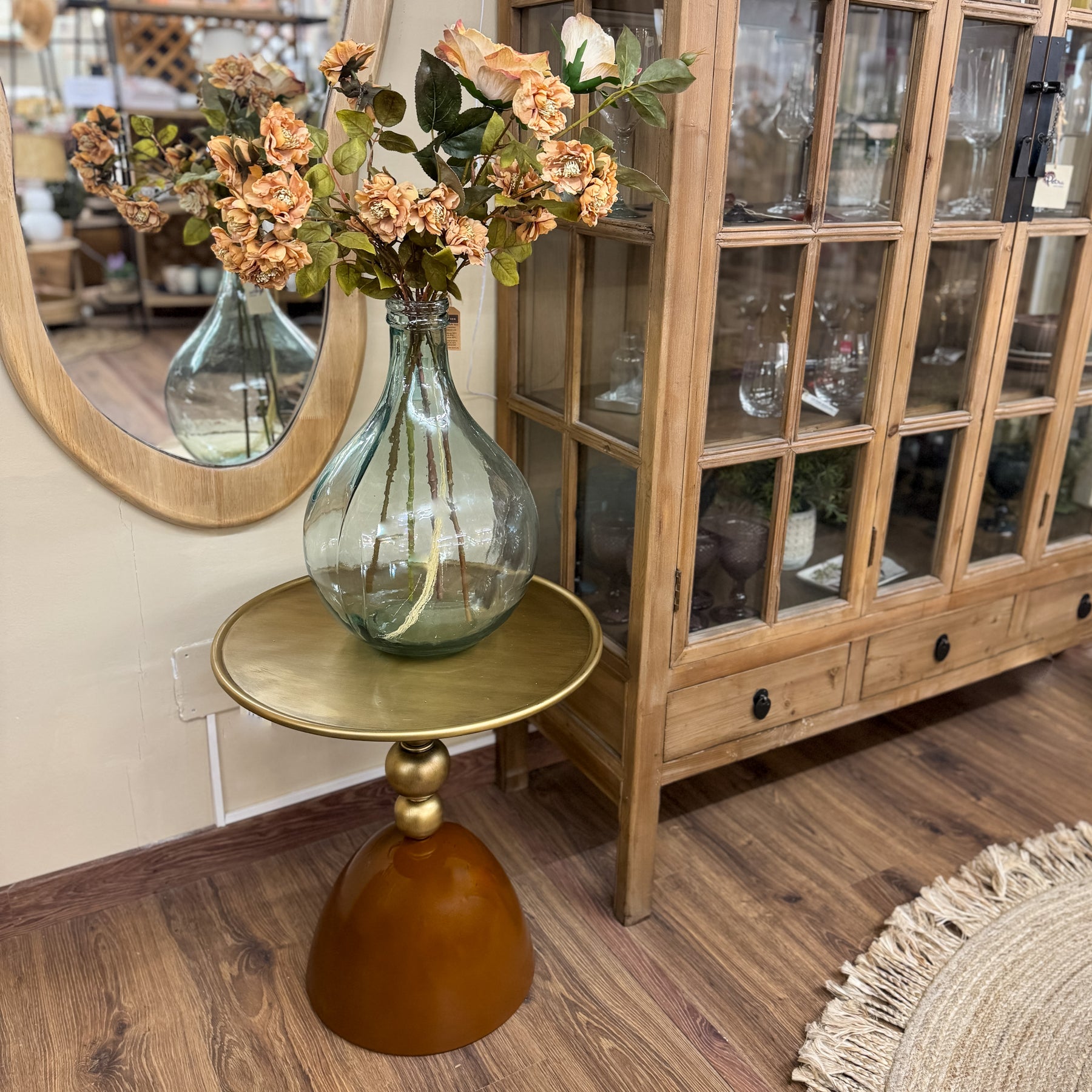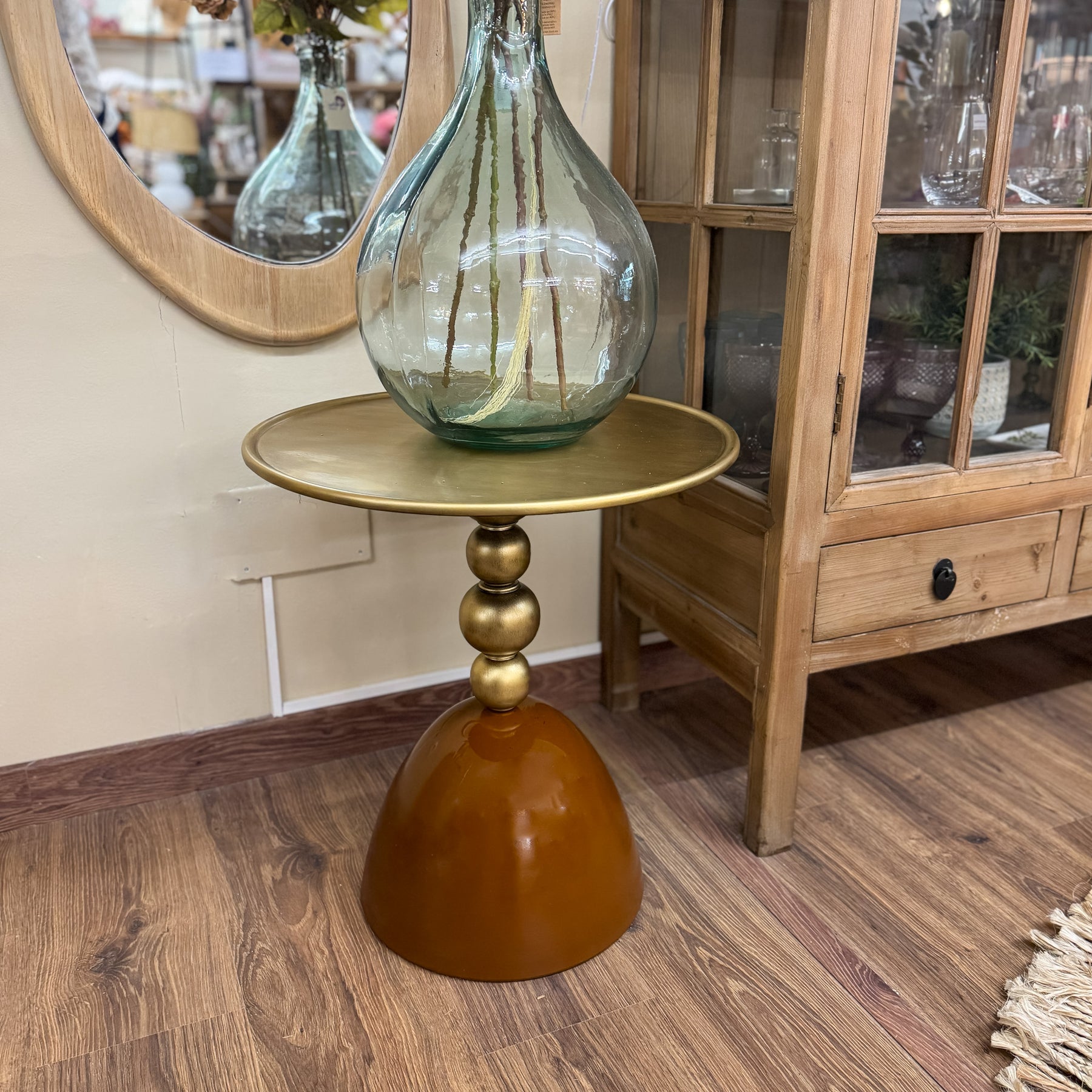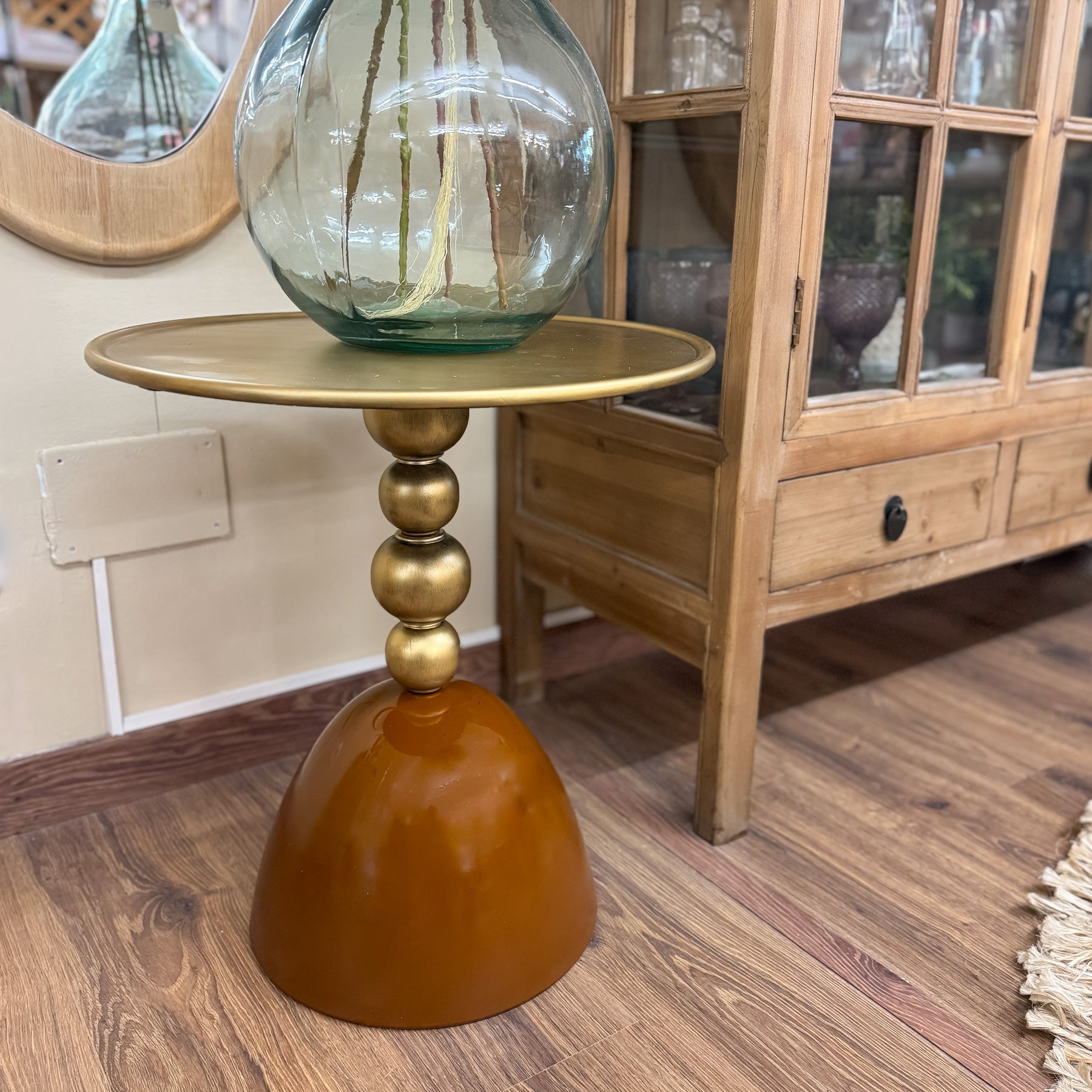Con un diseño atrevido y sofisticado, esta mesa auxiliar de metal se convierte en una pieza decorativa capaz de transformar cualquier rincón. Su estructura combina un acabado dorado en el sobre y en las esferas centrales con una base en tono cobrizo, creando un contraste elegante y lleno de personalidad.