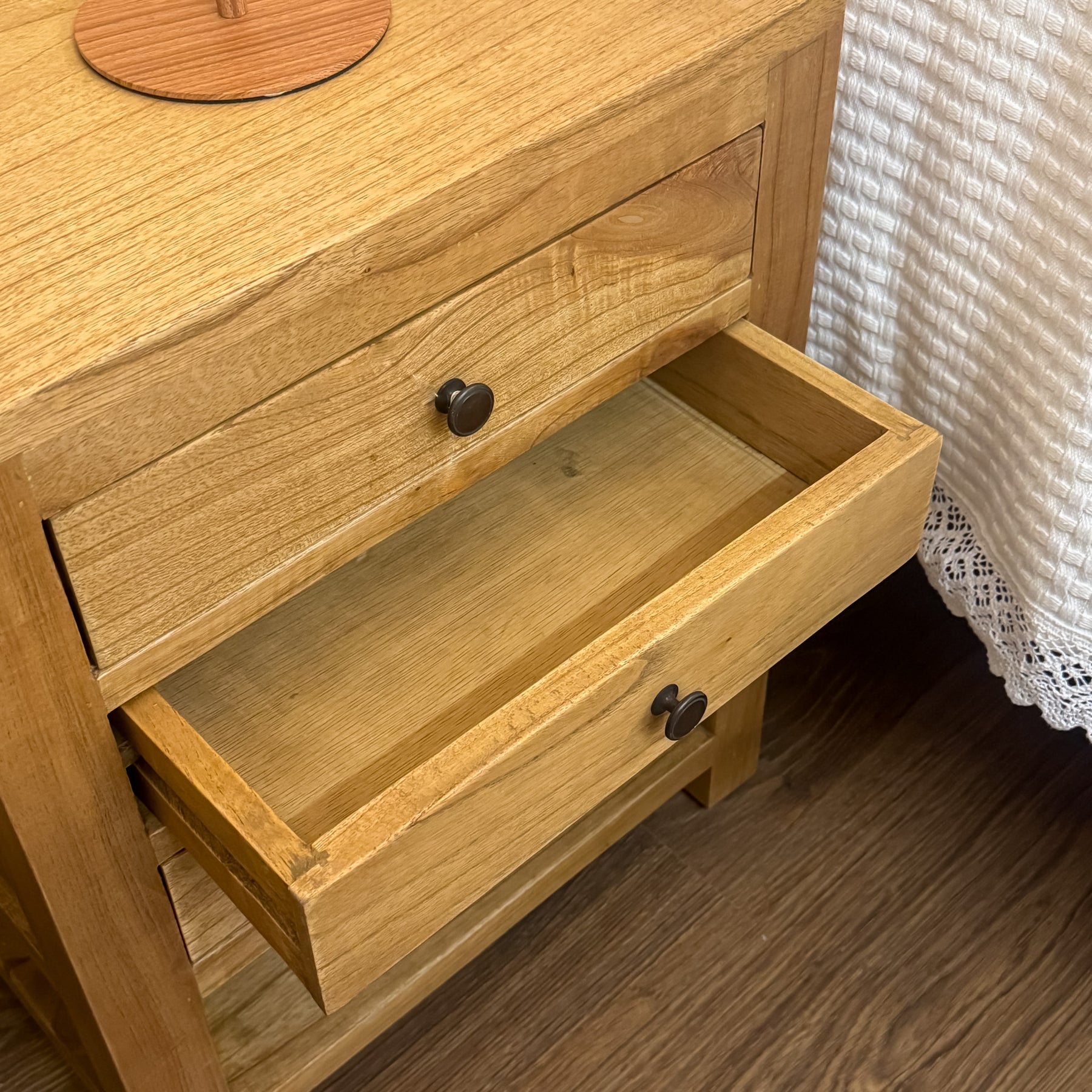 Esta mesita de noche de madera natural de 45x35x55 cm es el complemento perfecto para quienes buscan un dormitorio acogedor con esencia orgánica. Su diseño equilibrado resalta las vetas y tonalidades únicas de la madera, aportando una calidez visual que transforma cualquier estancia en un refugio de calma. Gracias a su tamaño compacto y funcional, esta pieza encaja a la perfección al lado de la cama, ofreciendo una superficie ideal para tus esenciales nocturnos y una estructura robusta que garantiza durabilidad.