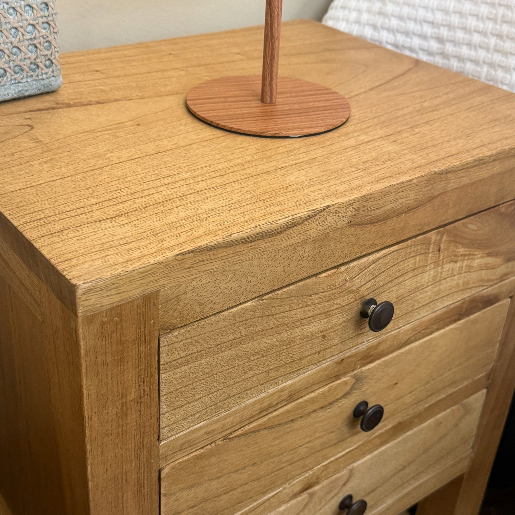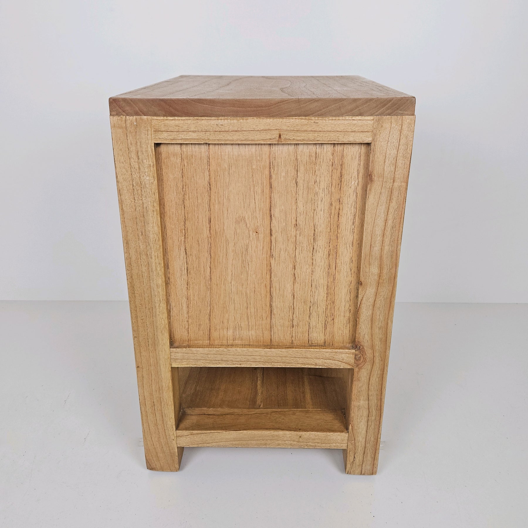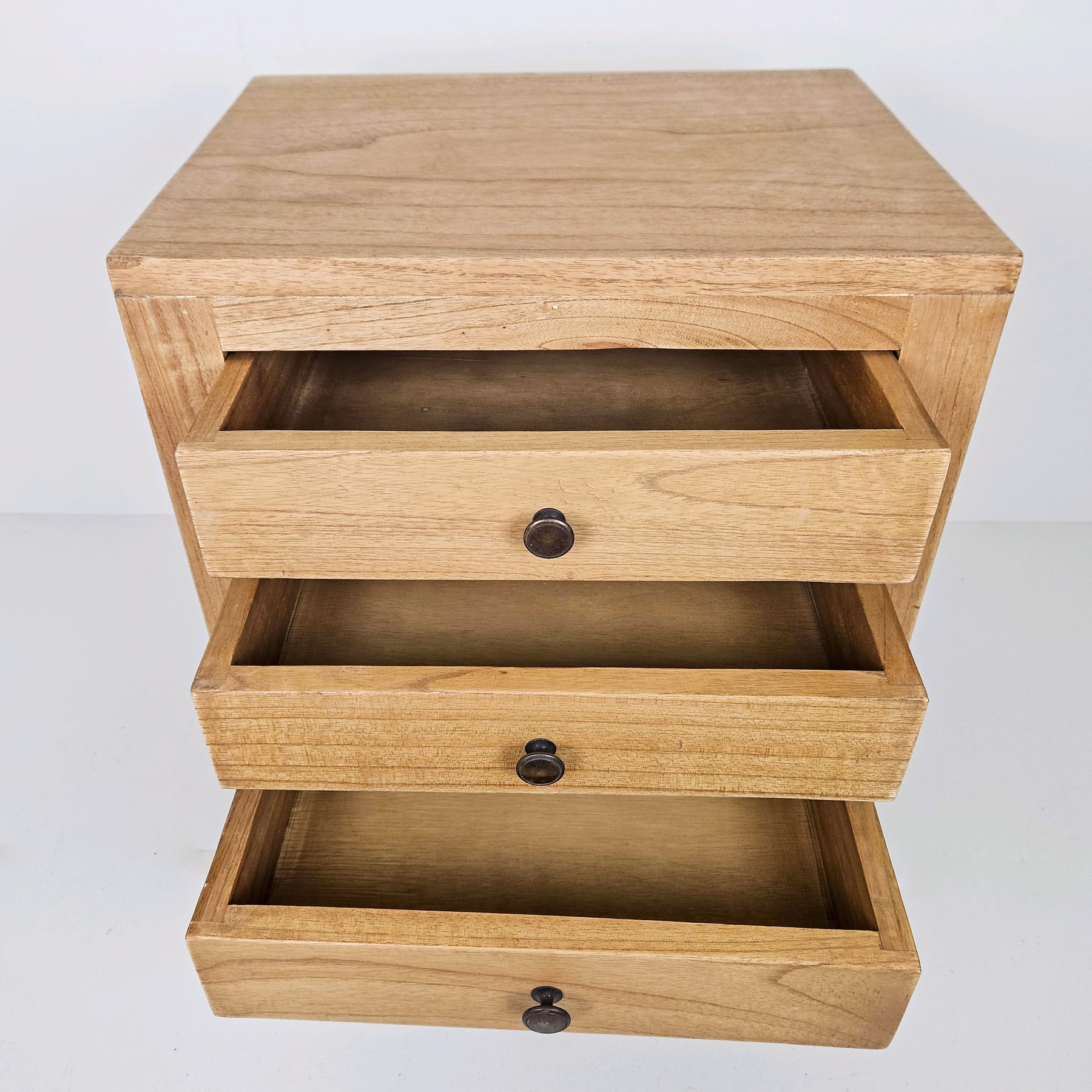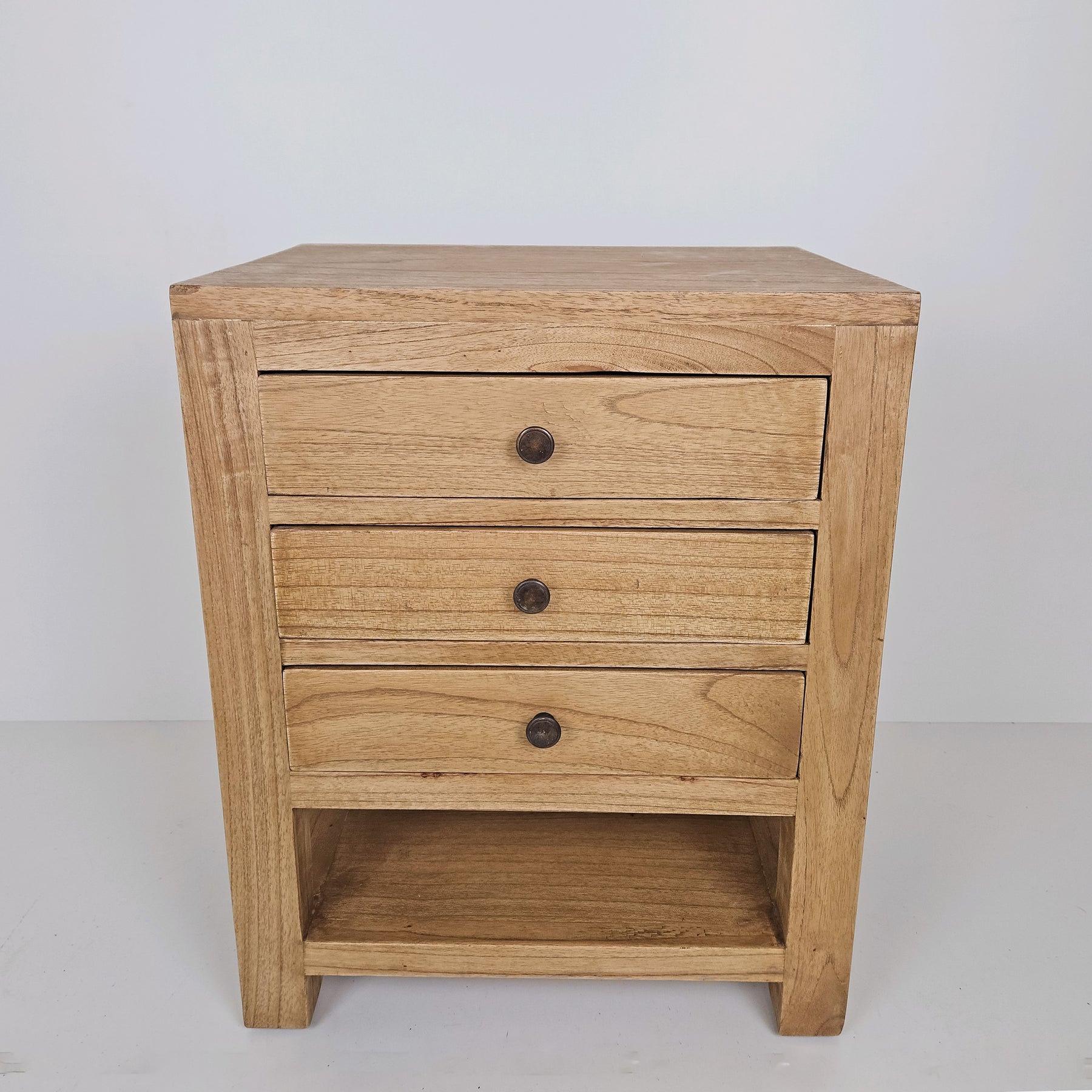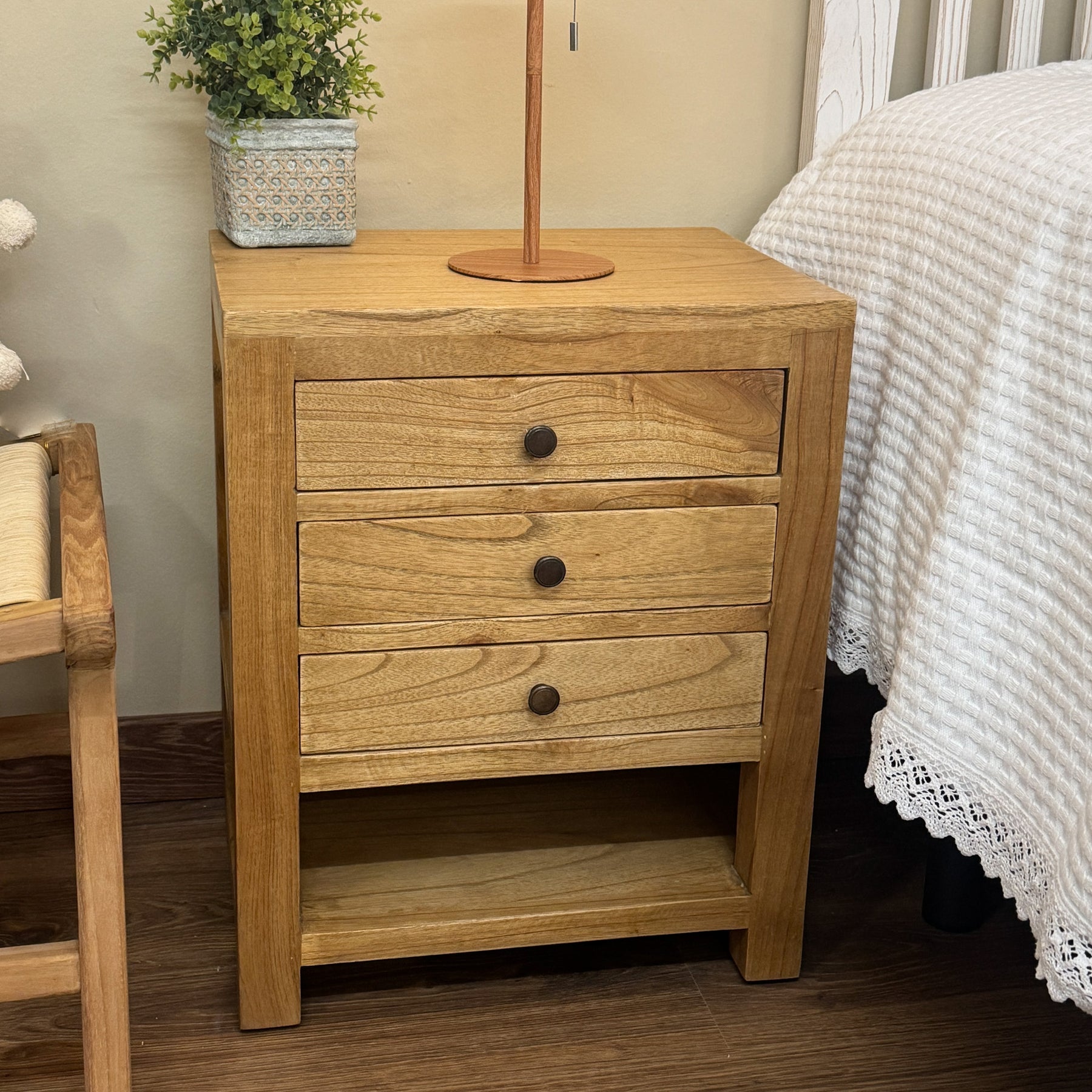 La funcionalidad de este mueble de madera natural se organiza en tres cajones con tiradores discretos y un estante inferior abierto, proporcionando un espacio de almacenaje versátil para mantener el orden. Sus medidas de 45 cm de ancho, 35 cm de fondo y 55 cm de alto permiten aprovechar el espacio sin recargar el ambiente, adaptándose tanto a dormitorios amplios como a rincones más reducidos. Además, su acabado natural facilita la integración en estilos decorativos rústicos, nórdicos o contemporáneos que valoran la honestidad de los materiales.