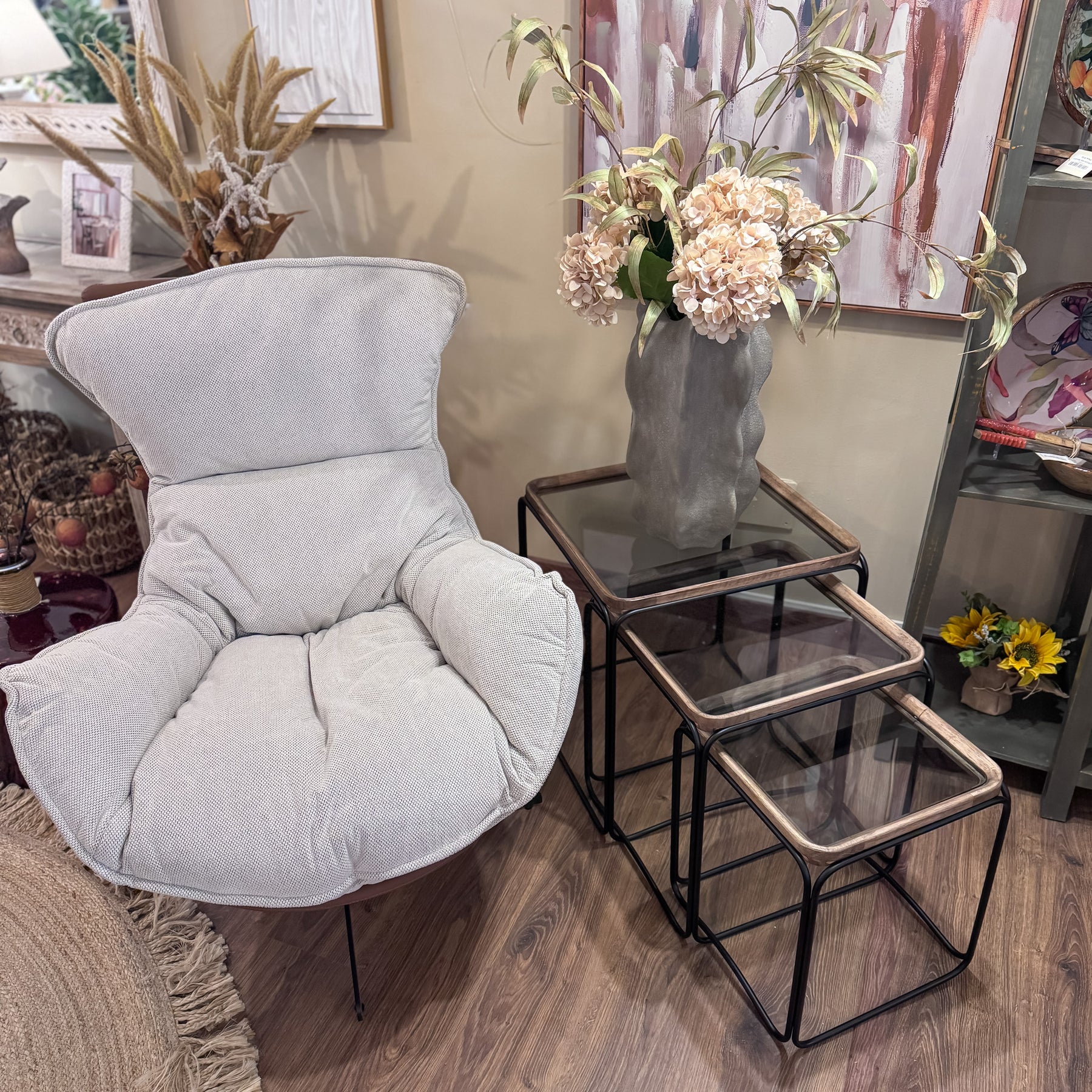 Con una medida de 50x50x54 cm para la mesa de mayor tamaño, este juego de mesas auxiliares ofrece una estética equilibrada que combina la transparencia del vidrio con la robustez del metal, permitiendo que la luz fluya a través de ellas y evitando recargar visualmente el espacio. Es un diseño pensado para adaptarse a salones de cualquier tamaño, funcionando perfectamente como superficie de apoyo principal o como puntos auxiliares distribuidos por la estancia.
