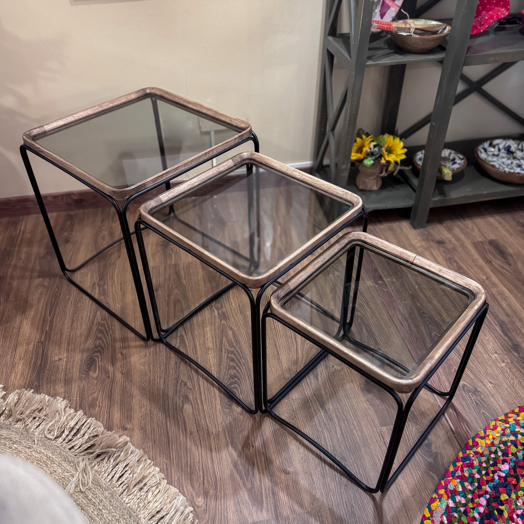 Este set de tres mesas nido es la solución definitiva para quienes buscan versatilidad y diseño de vanguardia en una sola pieza decorativa. El conjunto destaca por su estructura ligera de metal negro que sostiene con elegancia una superficie de cristal transparente, todo ello enmarcado por un sutil borde de madera natural que aporta calidez al diseño.