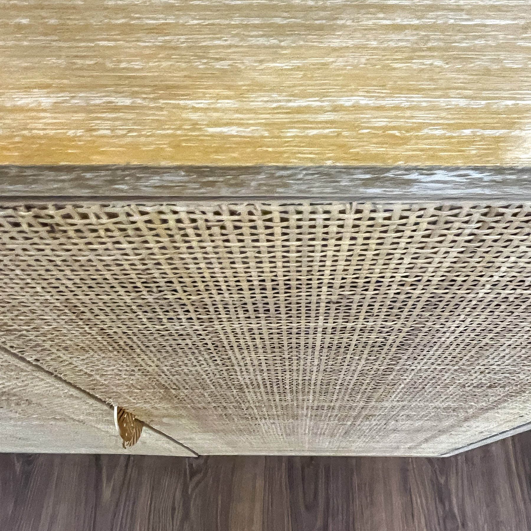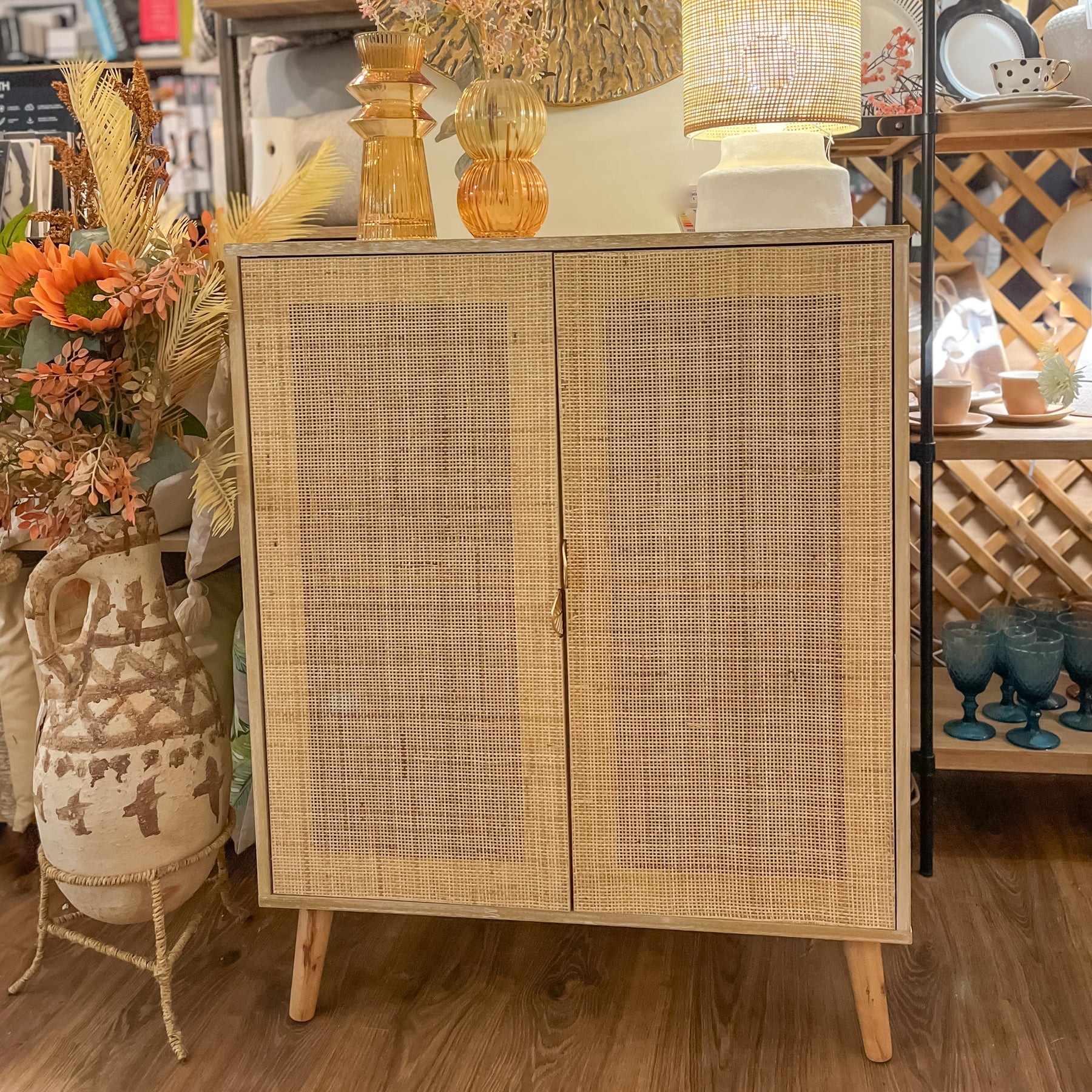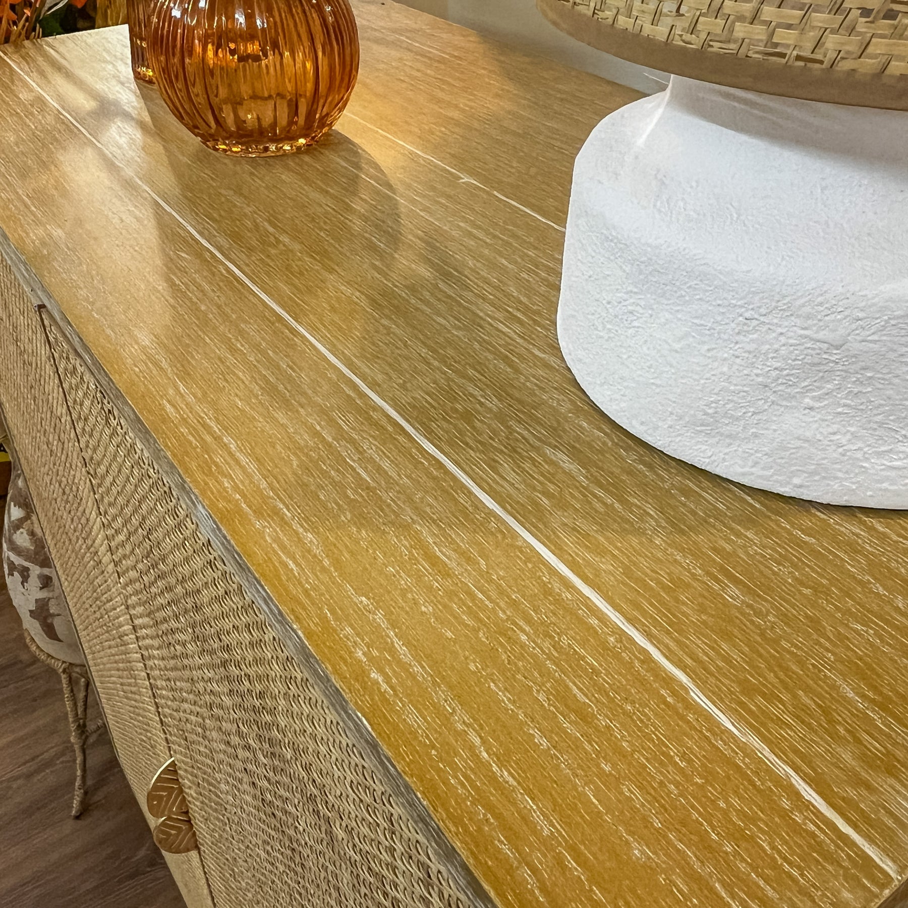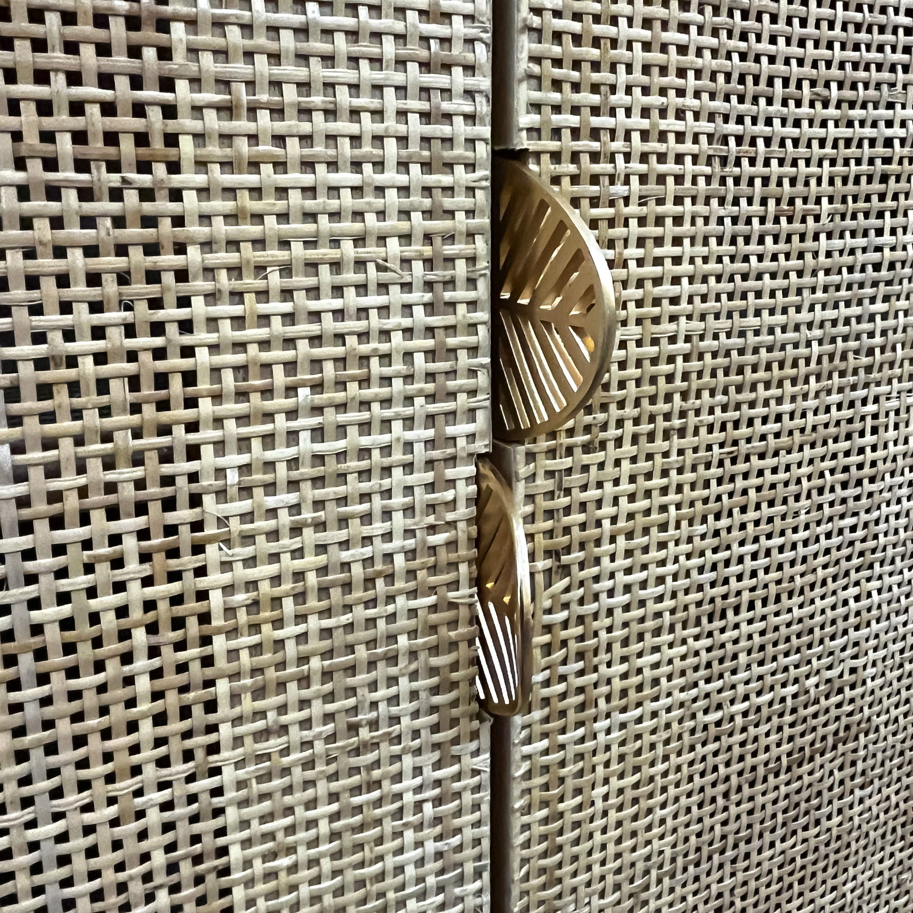 Este aparador demuestra que la falta de espacio no está reñida con el buen gusto. Su diseño fusiona la calidez atemporal de la madera natural con la frescura de las fibras vegetales, utilizando la técnica de rejilla o cannage en los frentes de las puertas. Esta combinación ligera permite que este mueble auxiliar respire y no recargue visualmente la habitación, algo esencial cuando buscamos decorar zonas de paso o estancias más reducidas.