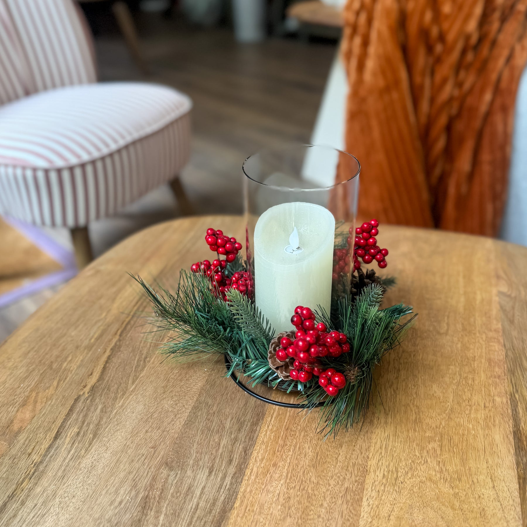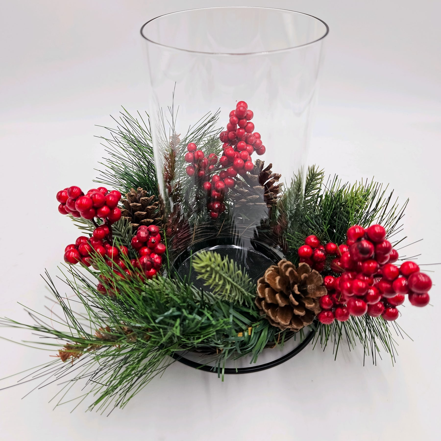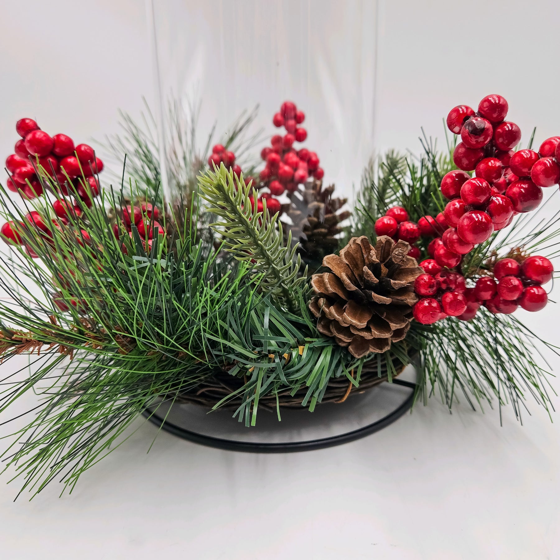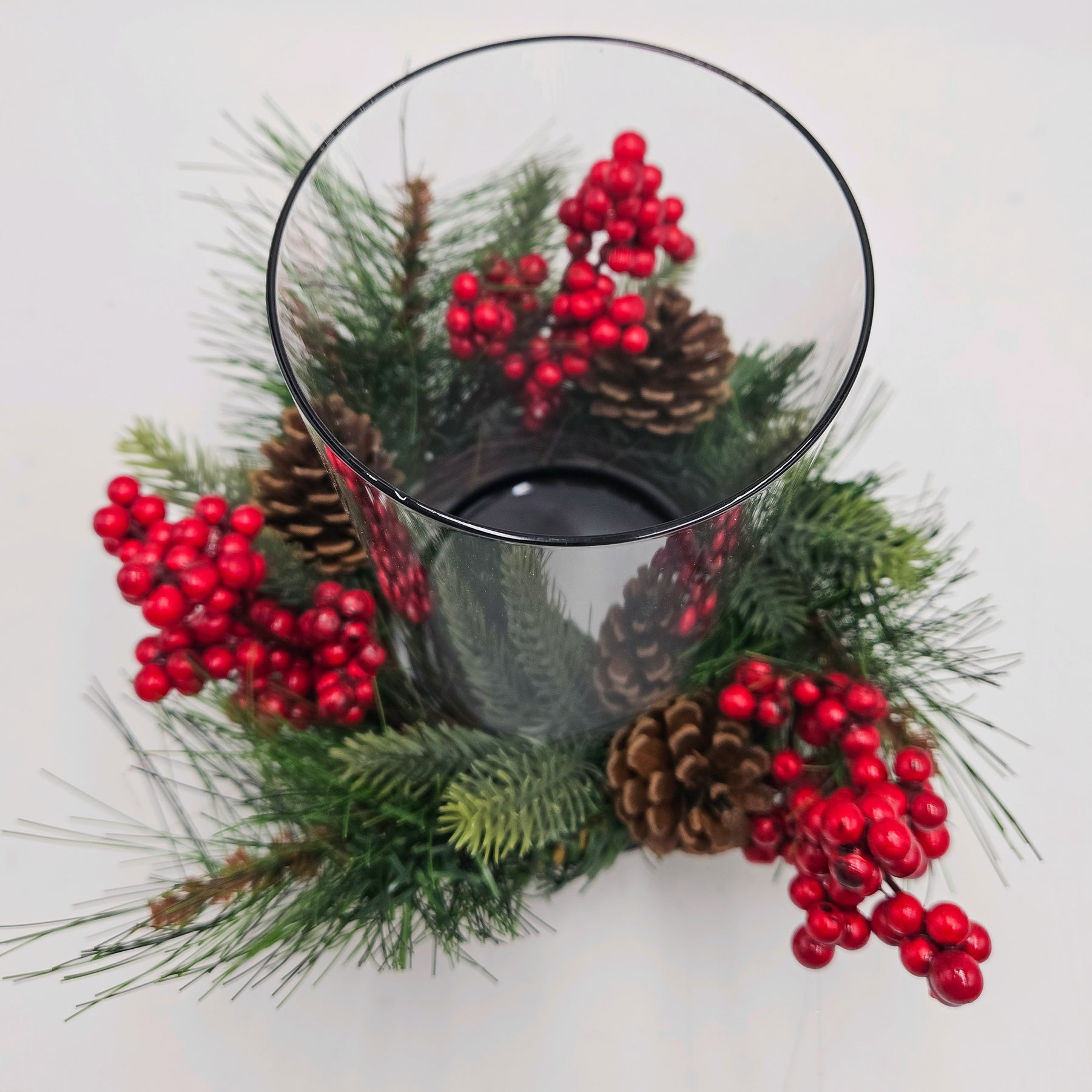Este portavelas de cristal con corona decorativa combina la calidez de la luz con el encanto natural de la Navidad. Su diseño transparente realza la vela interior, rodeada por una guirnalda de piñas, ramas verdes y bayas rojas que aportan color y frescura a cualquier rincón.