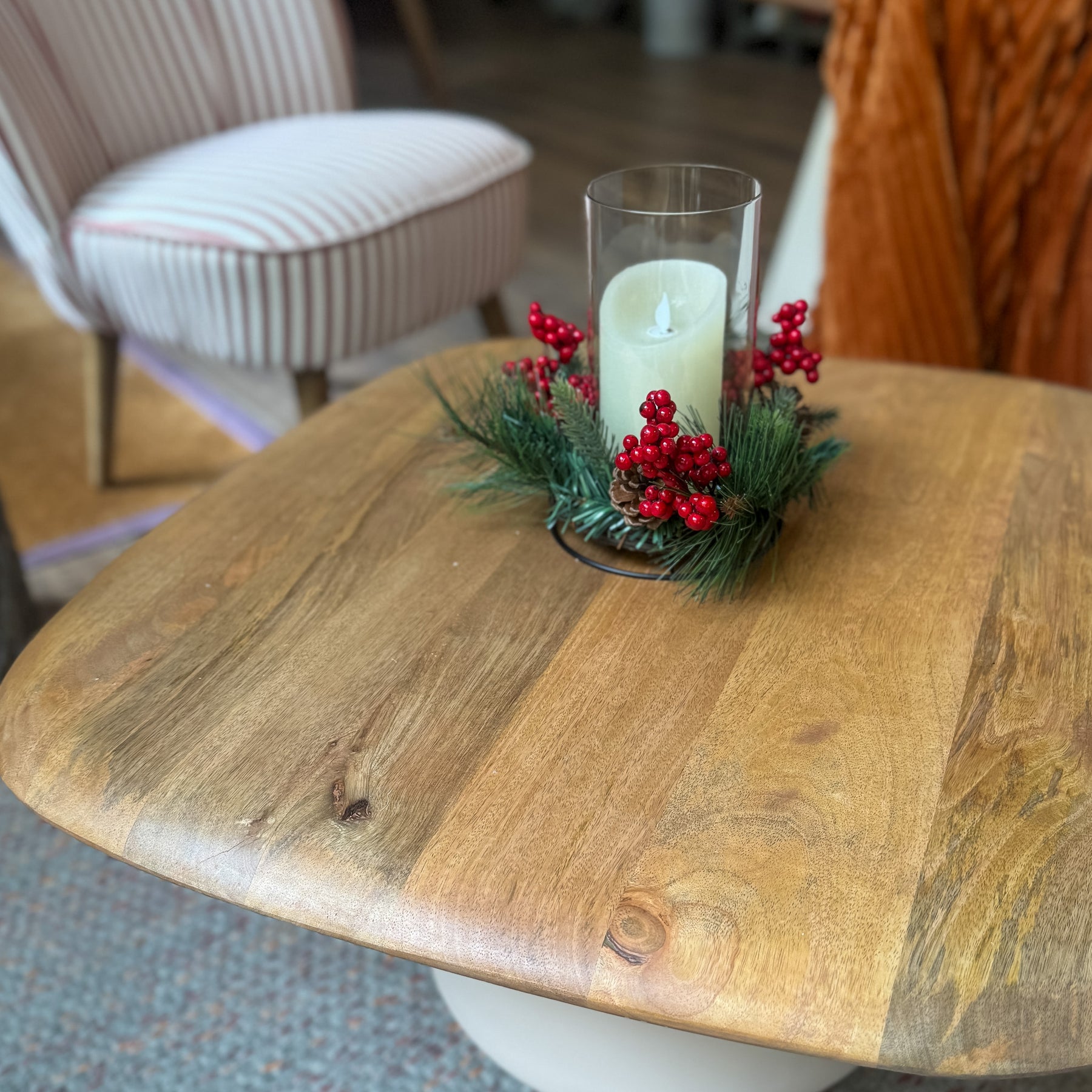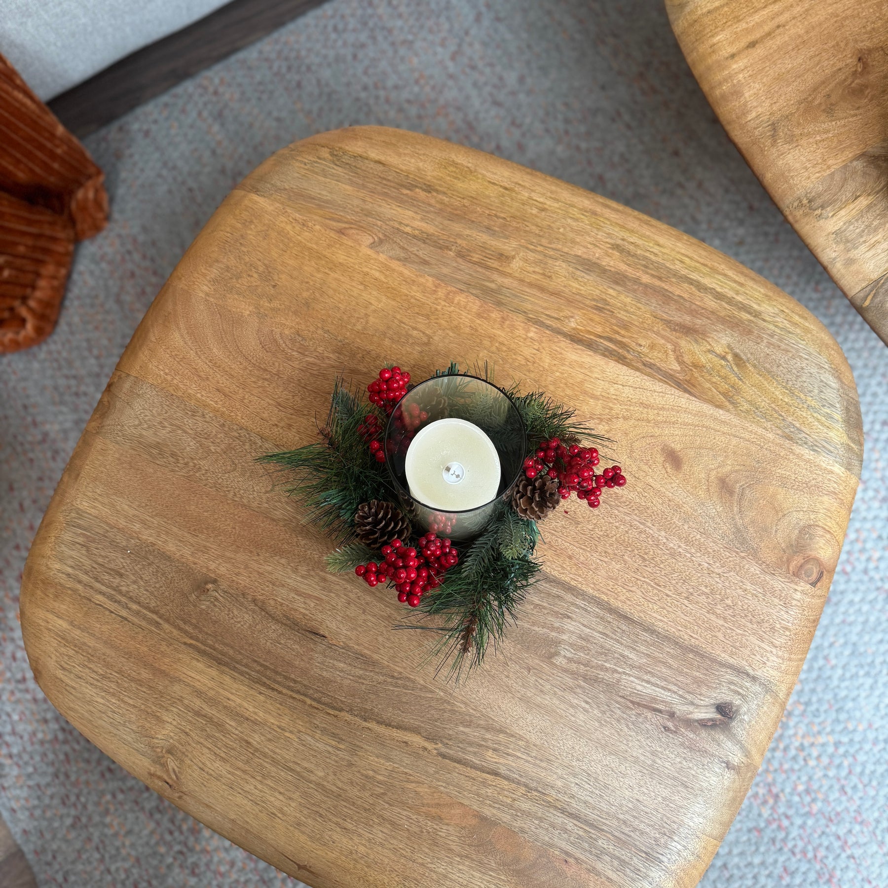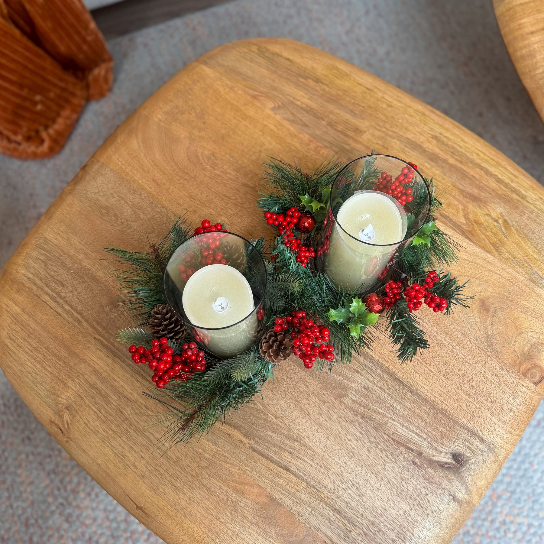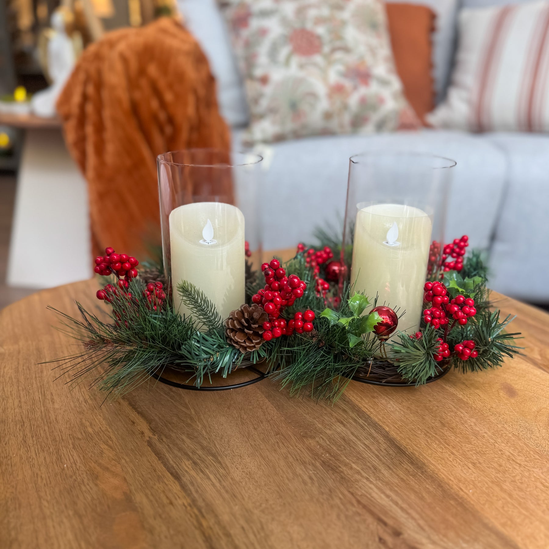 Este portavelas de cristal con corona decorativa combina la calidez de la luz con el encanto natural de la Navidad. Su diseño transparente realza la vela interior, rodeada por una guirnalda de piñas, ramas verdes y bayas rojas que aportan color y frescura a cualquier rincón.