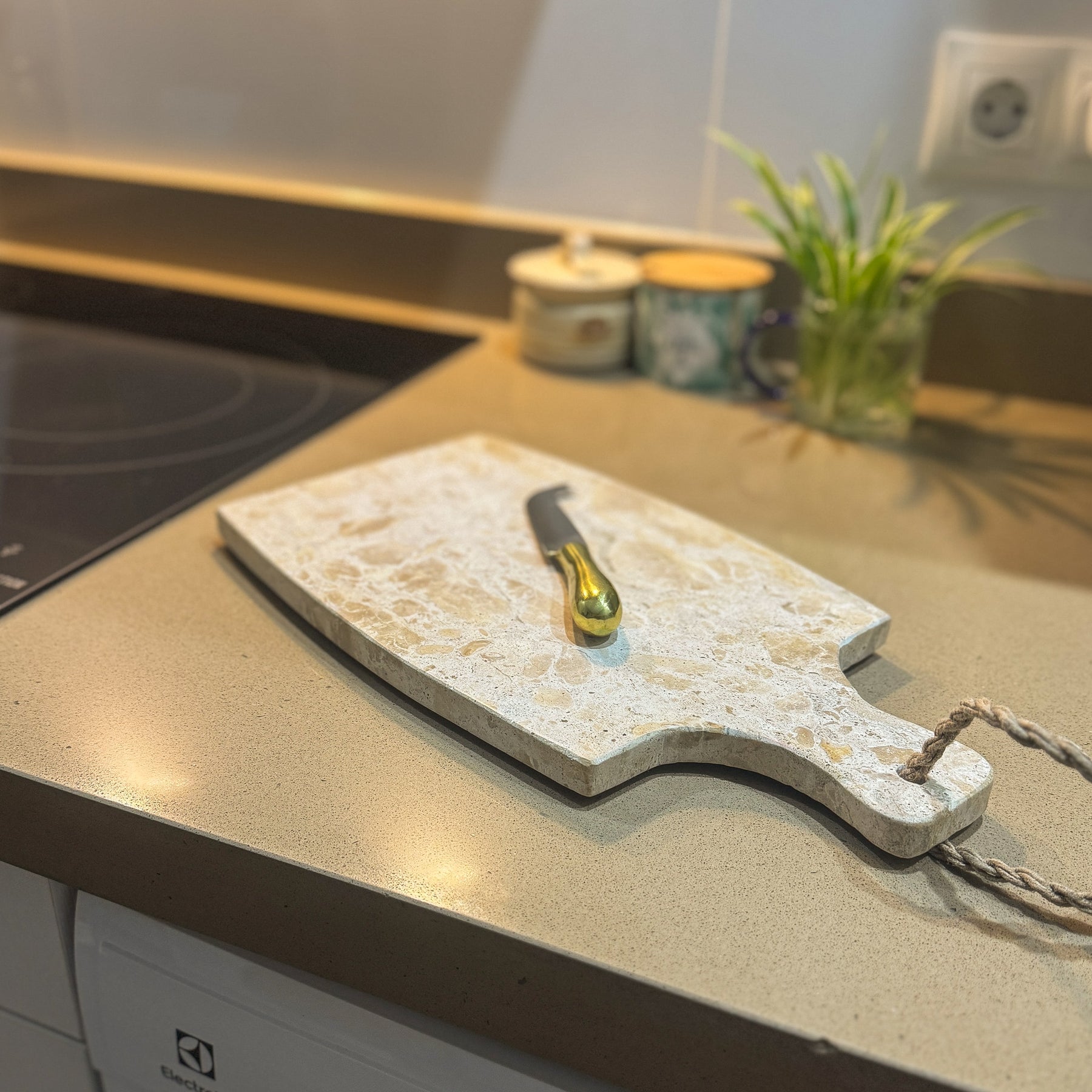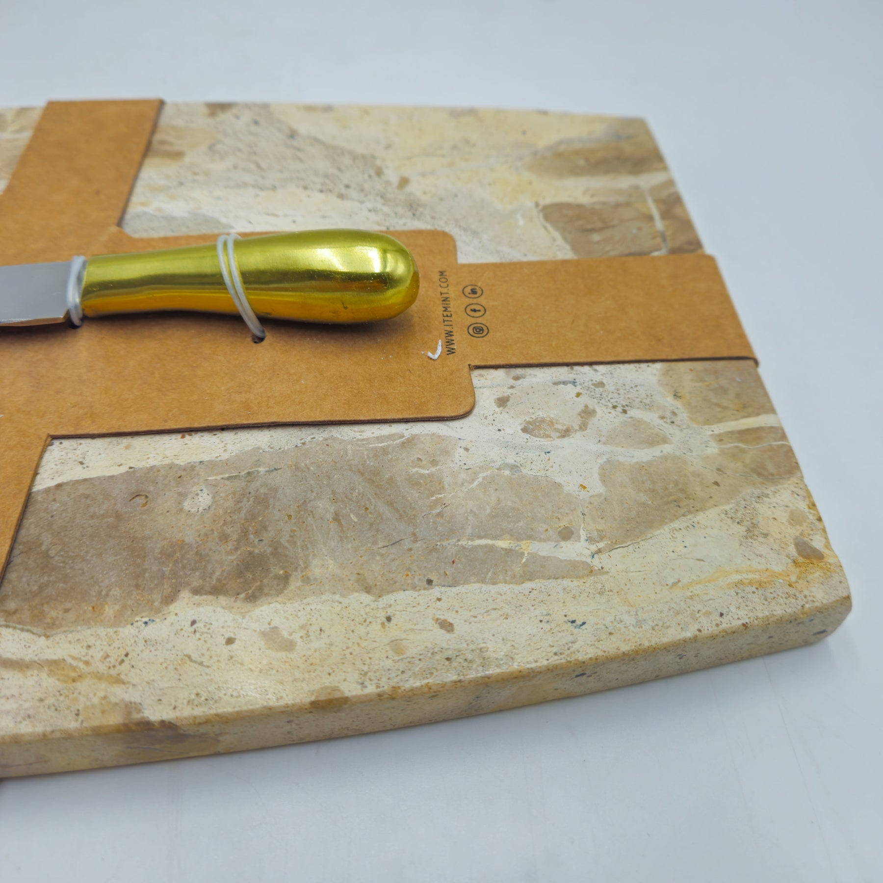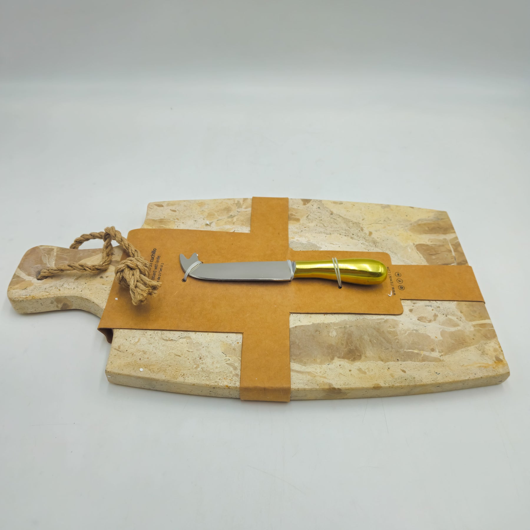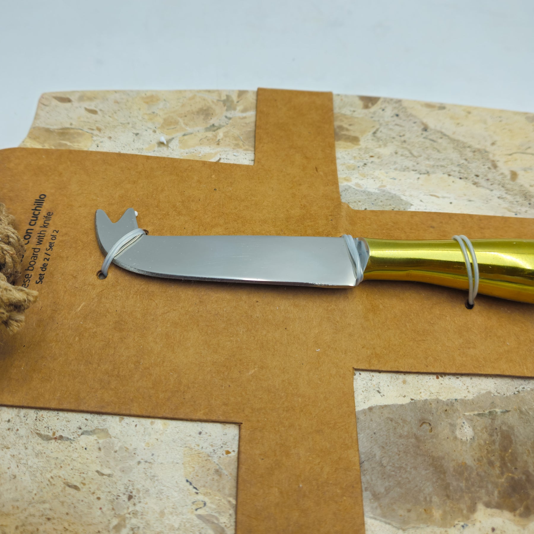 La tabla de cortar es de mármol y el cuchillo de acero inoxidable color dorado