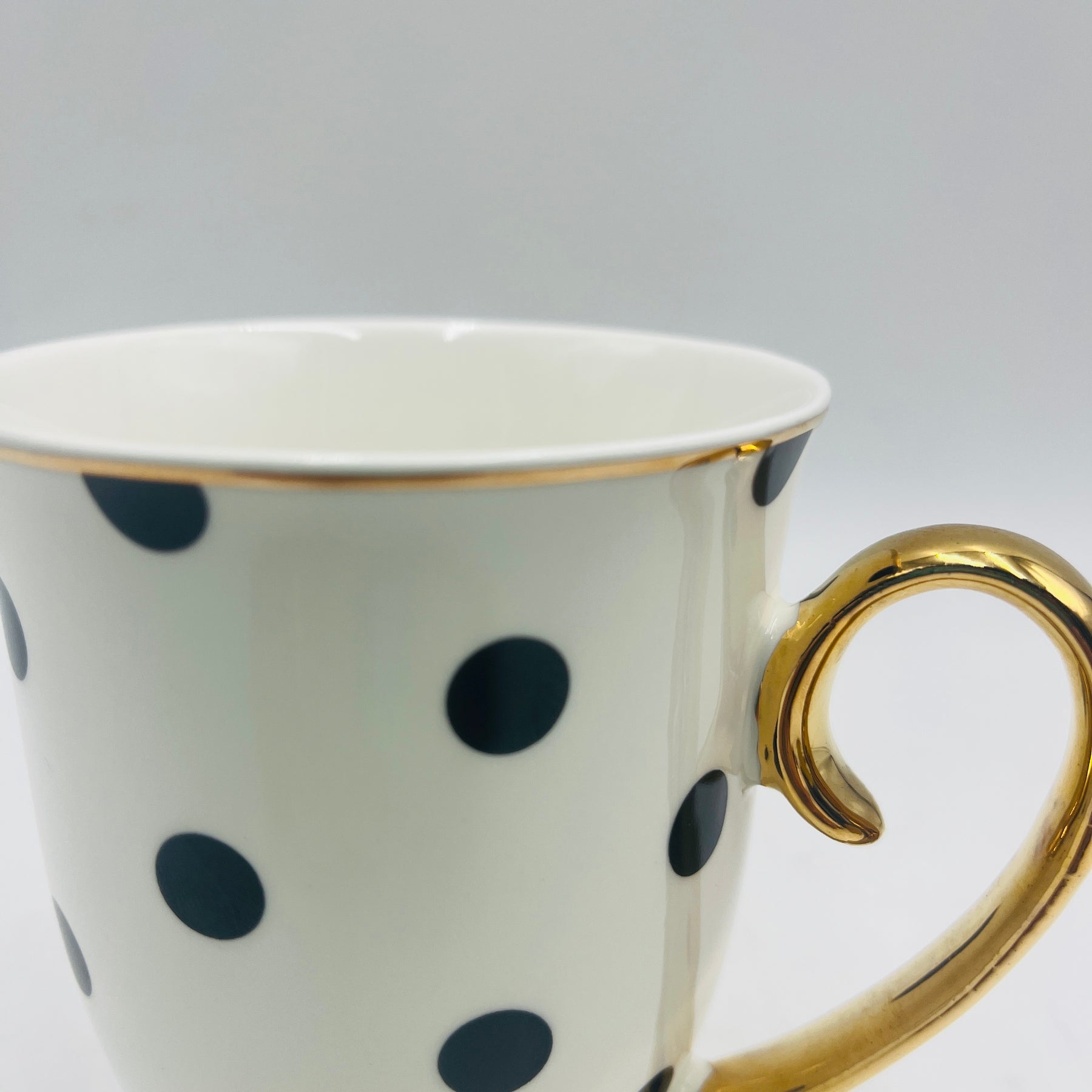 Llena tu mesa de estilo con esta taza de porcelana de lunares negro y blanco. Una taza de té o café con elegantes bordes en dorado que le darán un toque de estilo y sofisticación a tu mesa. Fabricada en porcelana y con medidas de 9x12x11 cm, es perfecta para un café con amigas, el té de la tarde o para vestir tu cocina con un detalle especial. Se venden por unidades. Cada taza viene en una caja individual muy especial, perfecta para regalar.