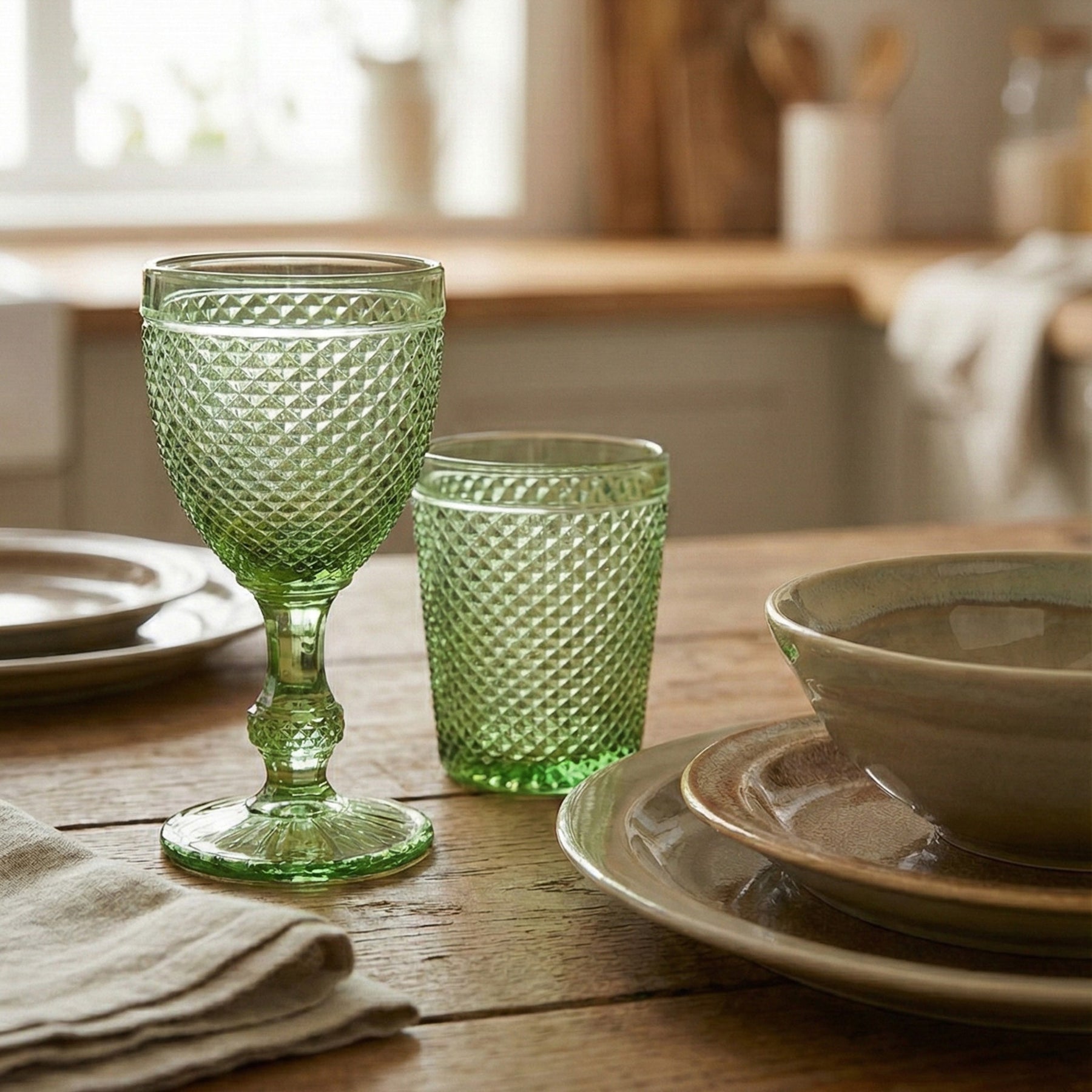 Si buscas añadir un toque de frescura y textura a tu mesa, este vaso de cristal verde con relieve es la pieza ideal. Su diseño de inspiración vintage, con un patrón geométrico tallado, captura la luz de forma preciosa y ofrece un agarre muy cómodo y sólido. 🥂
