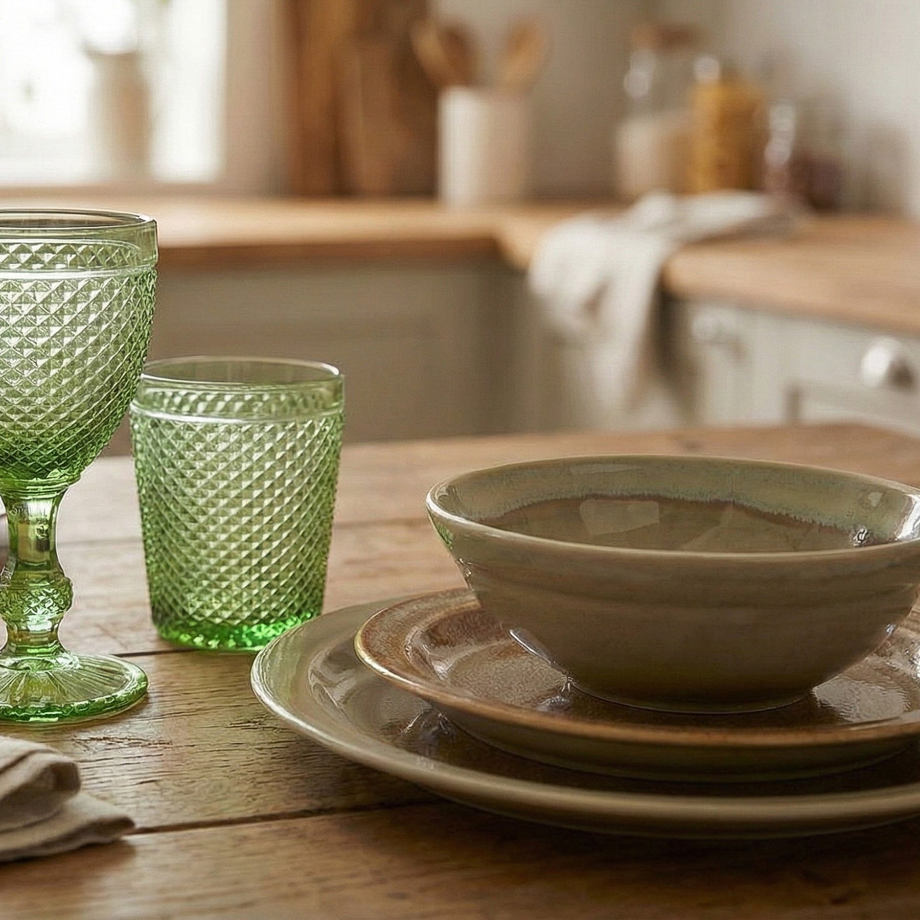 Está fabricado en cristal de gran resistencia y su tono verde aporta una serenidad que encaja tanto en cenas especiales como en el día a día. Con unas medidas de 8x8x10 cm, es un básico versátil que eleva la estética de cualquier rincón.