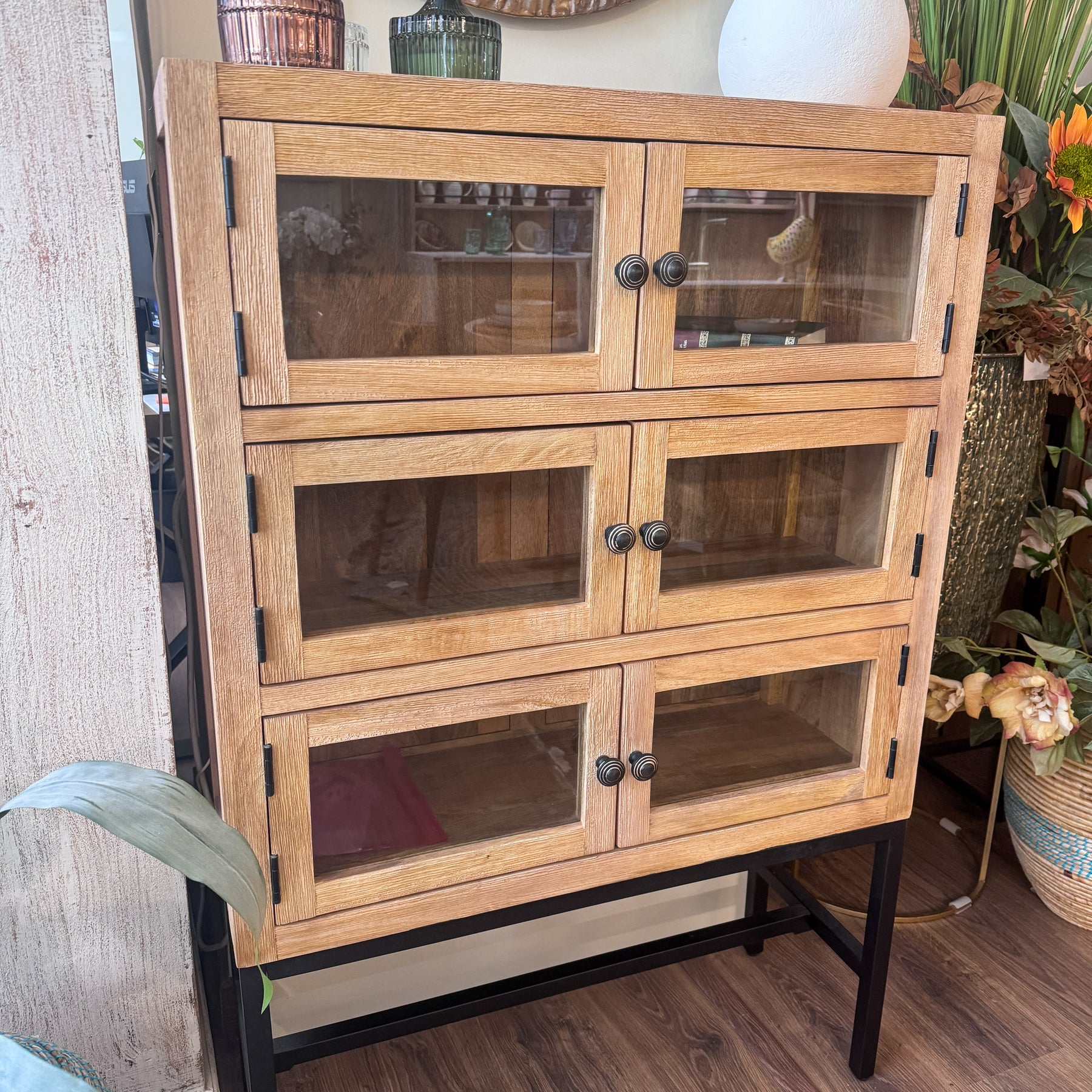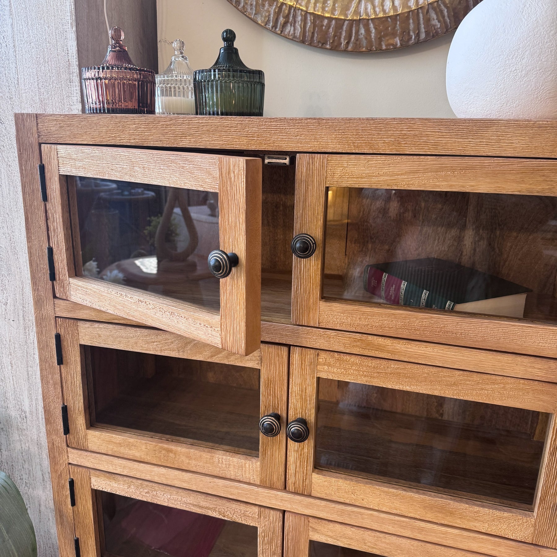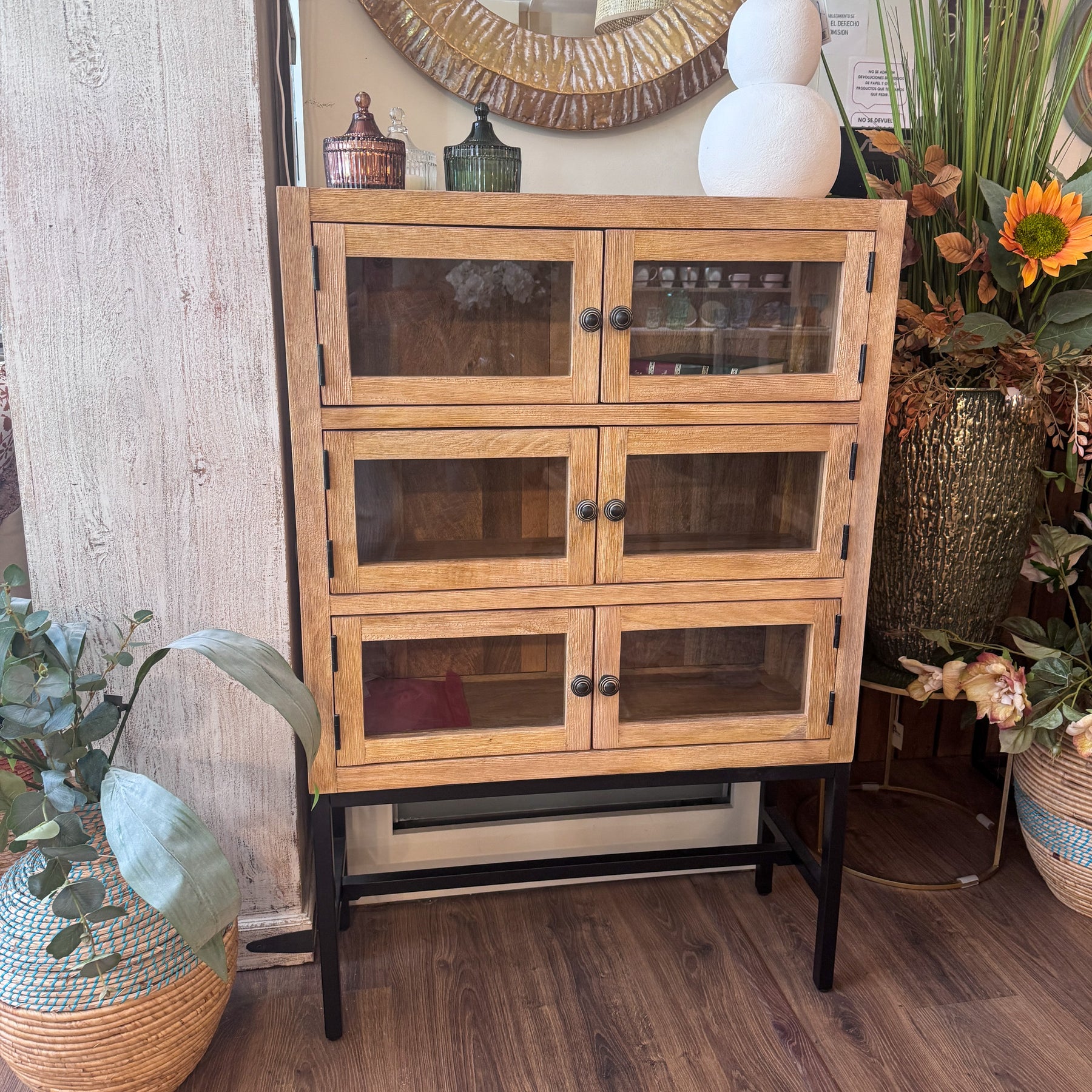 Para integrar esta vitrina en tu hogar, puedes aprovechar sus estantes para organizar tus objetos favoritos. Los pomos circulares de metal oscuro añaden un detalle artesanal que refuerza su carácter único. Es una opción perfecta para quienes buscan mobiliario de calidad con un toque de diseño atemporal.