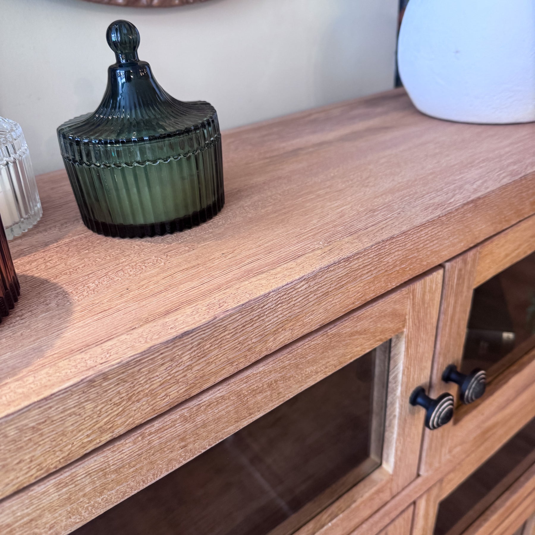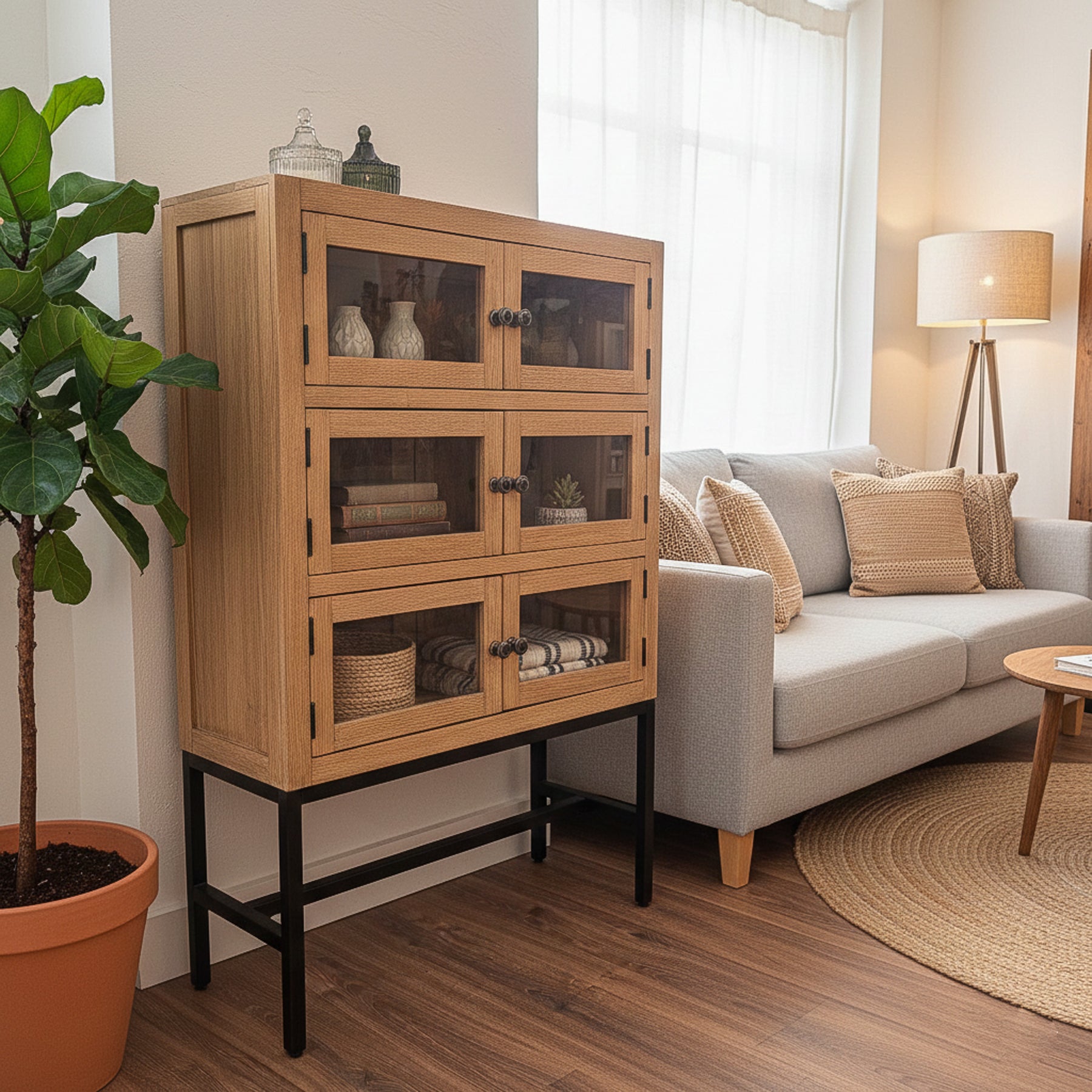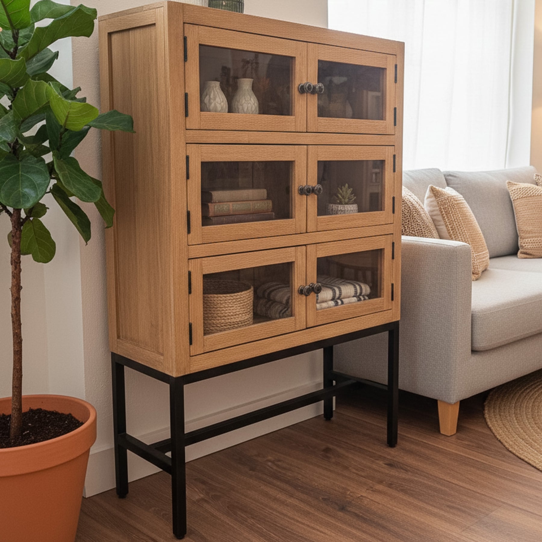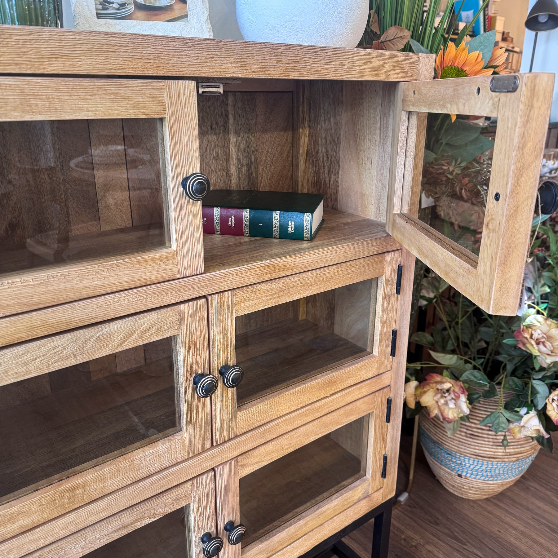 Para integrar esta vitrina en tu hogar, puedes aprovechar sus estantes para organizar tus objetos favoritos. Los pomos circulares de metal oscuro añaden un detalle artesanal que refuerza su carácter único. Es una opción perfecta para quienes buscan mobiliario de calidad con un toque de diseño atemporal.